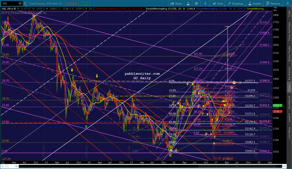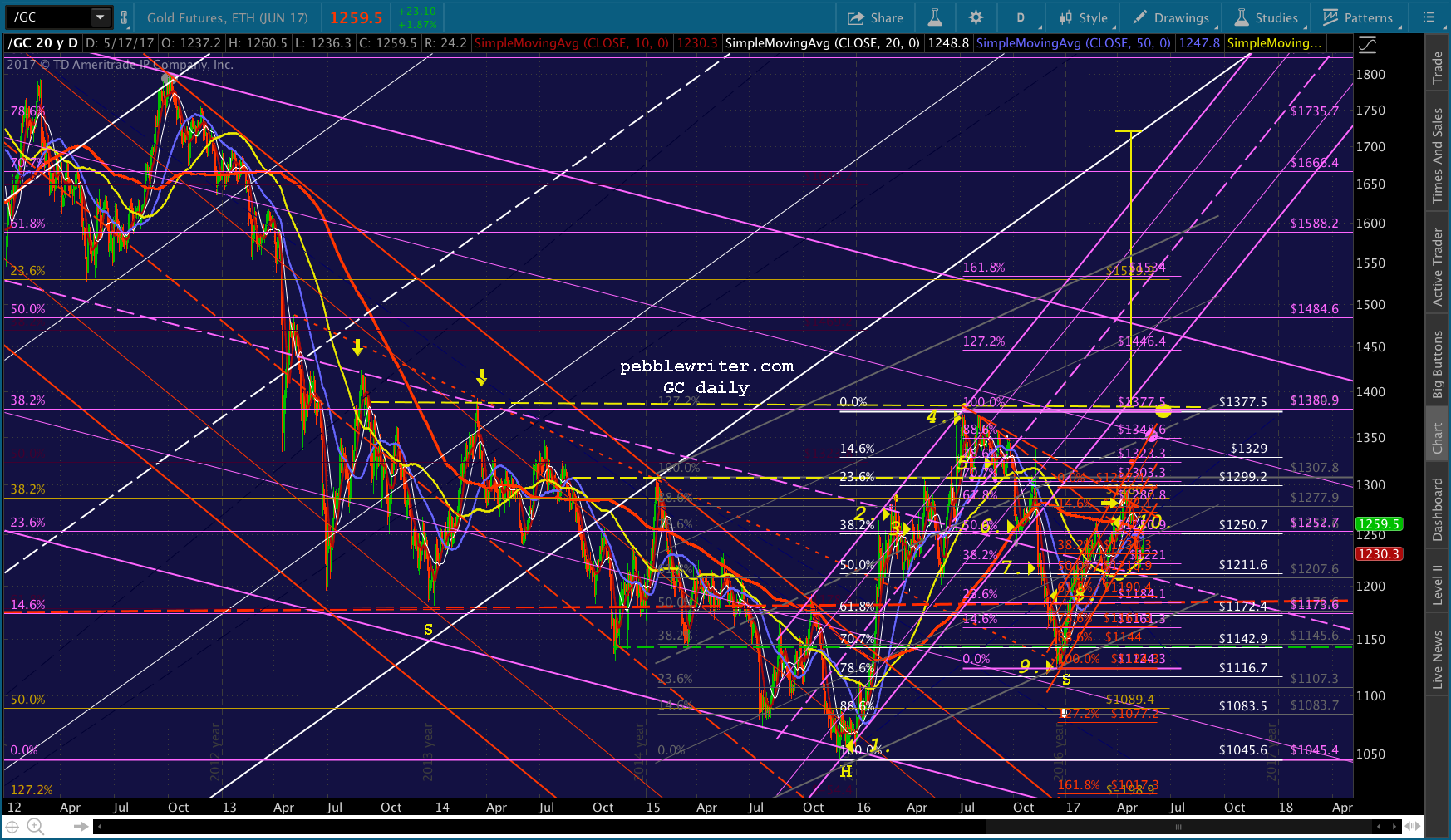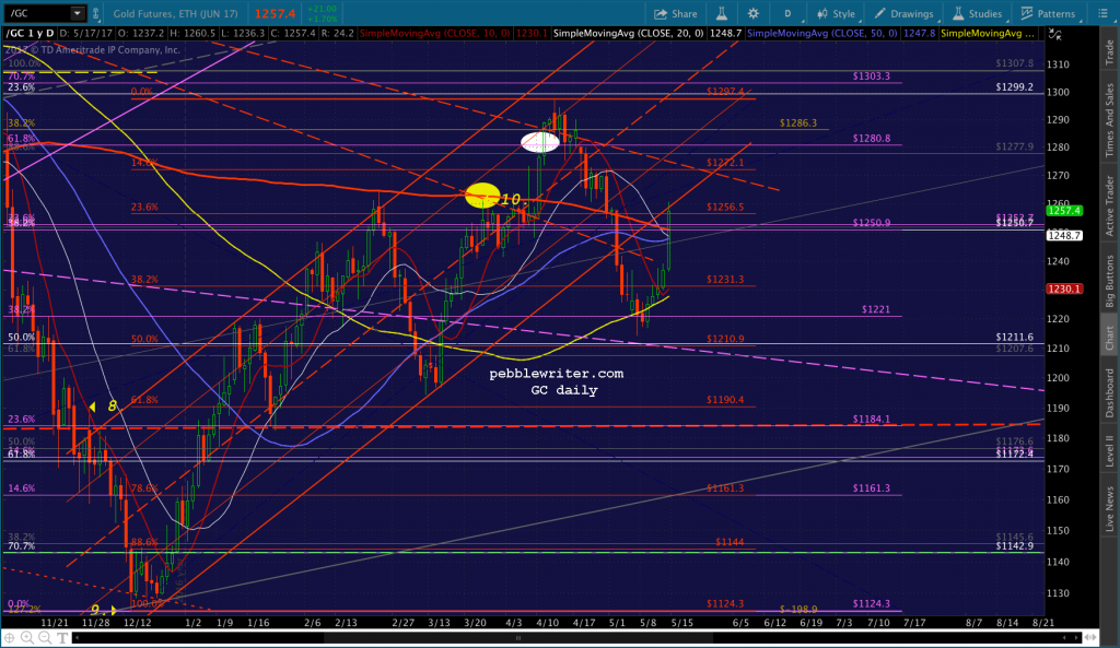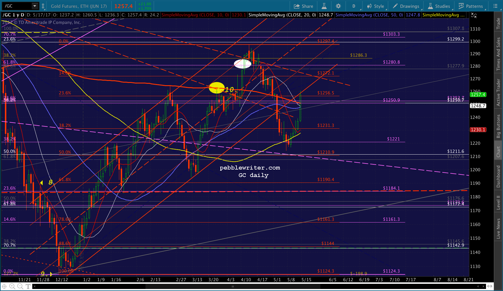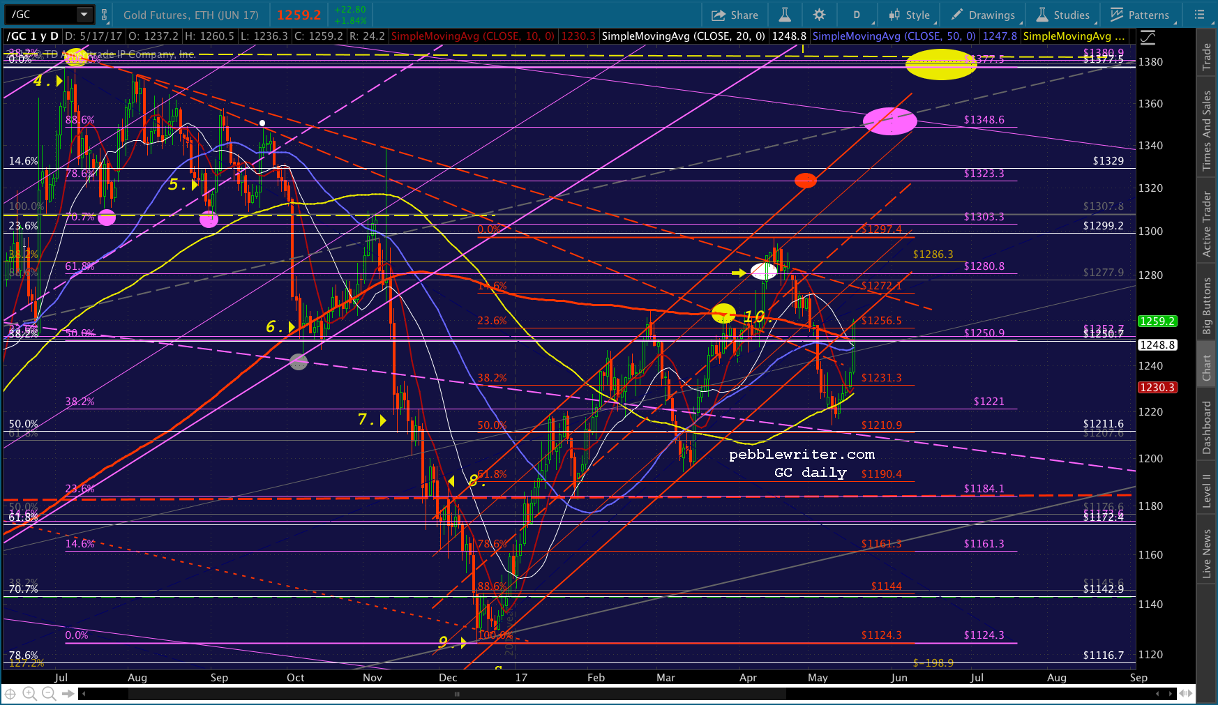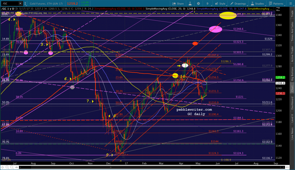 But, the fact that GC got a nice bounce off the channel midline suggests more upside, perhaps to the falling purple channel’s .786 line. I originally put the purple dot there where it intersects with the purple .886 at 1348.60 around the end of May.