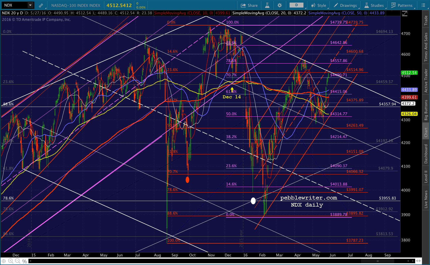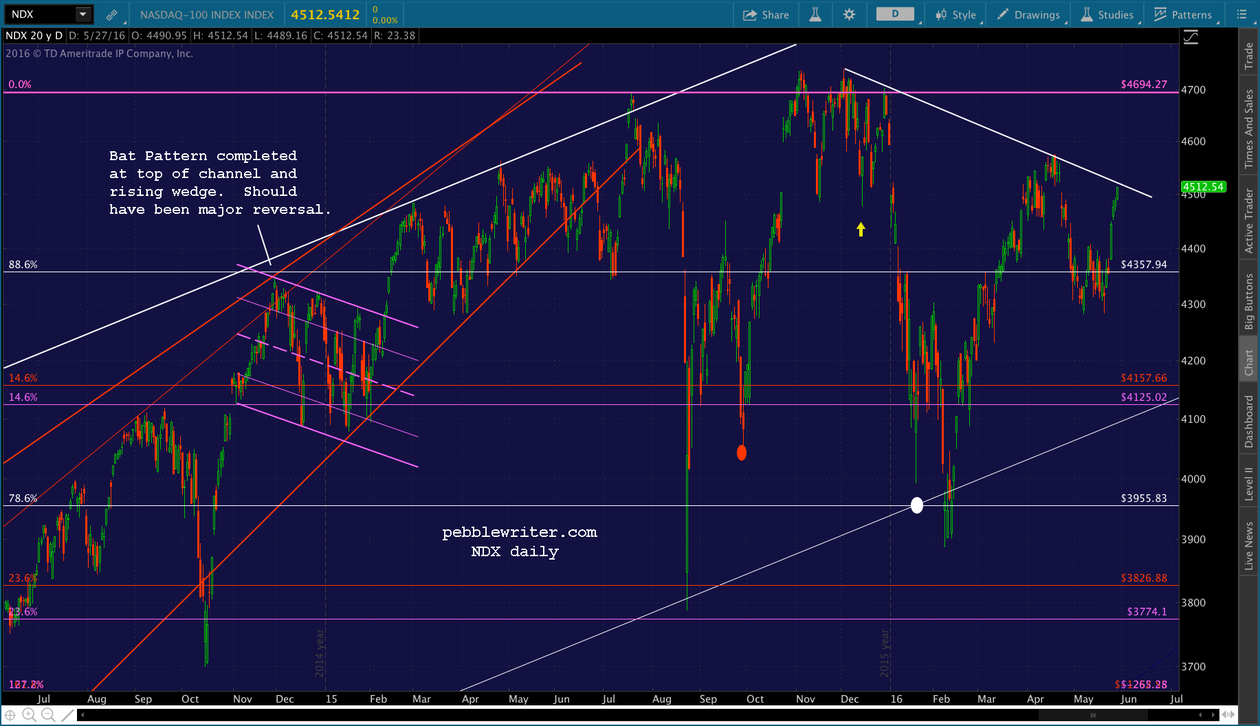 Third, note that it already retraced 78.6% of its drop from 4739 to 3889 — a move that appears more impulsive rather than corrective. When it reversed at the white channel top in April, it only made it down to the .786 line before bouncing right back.