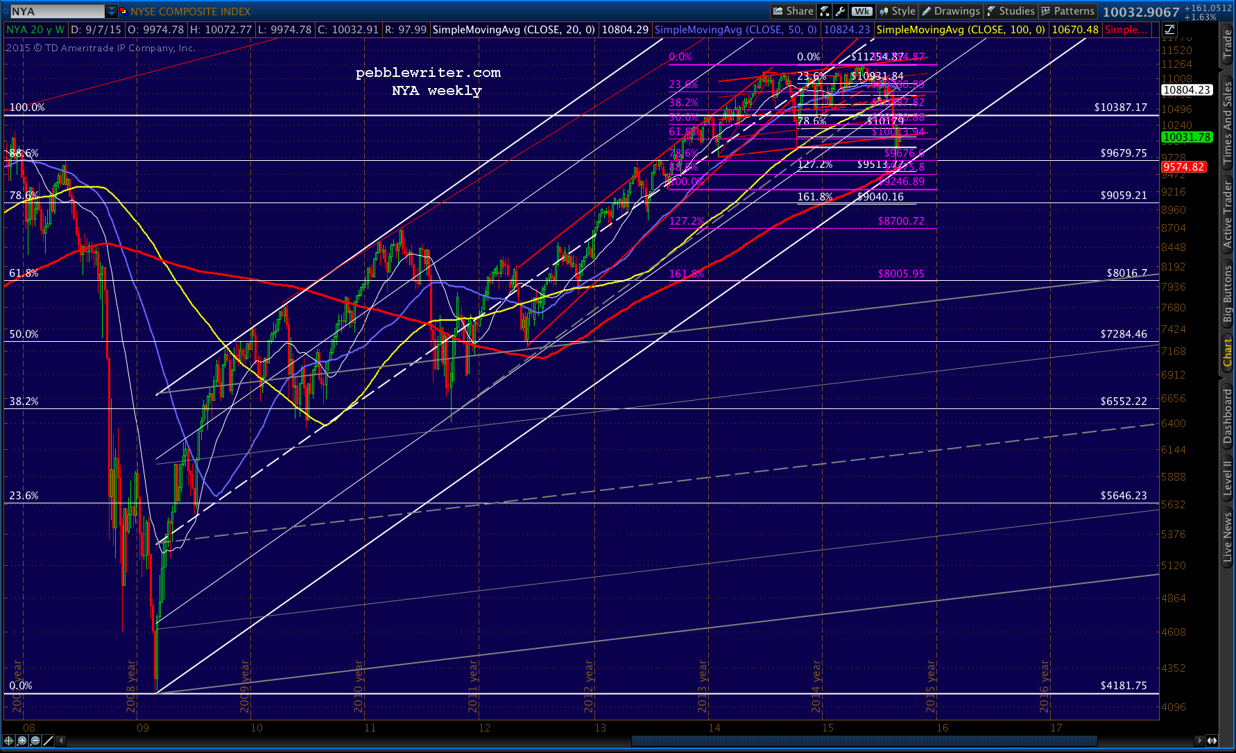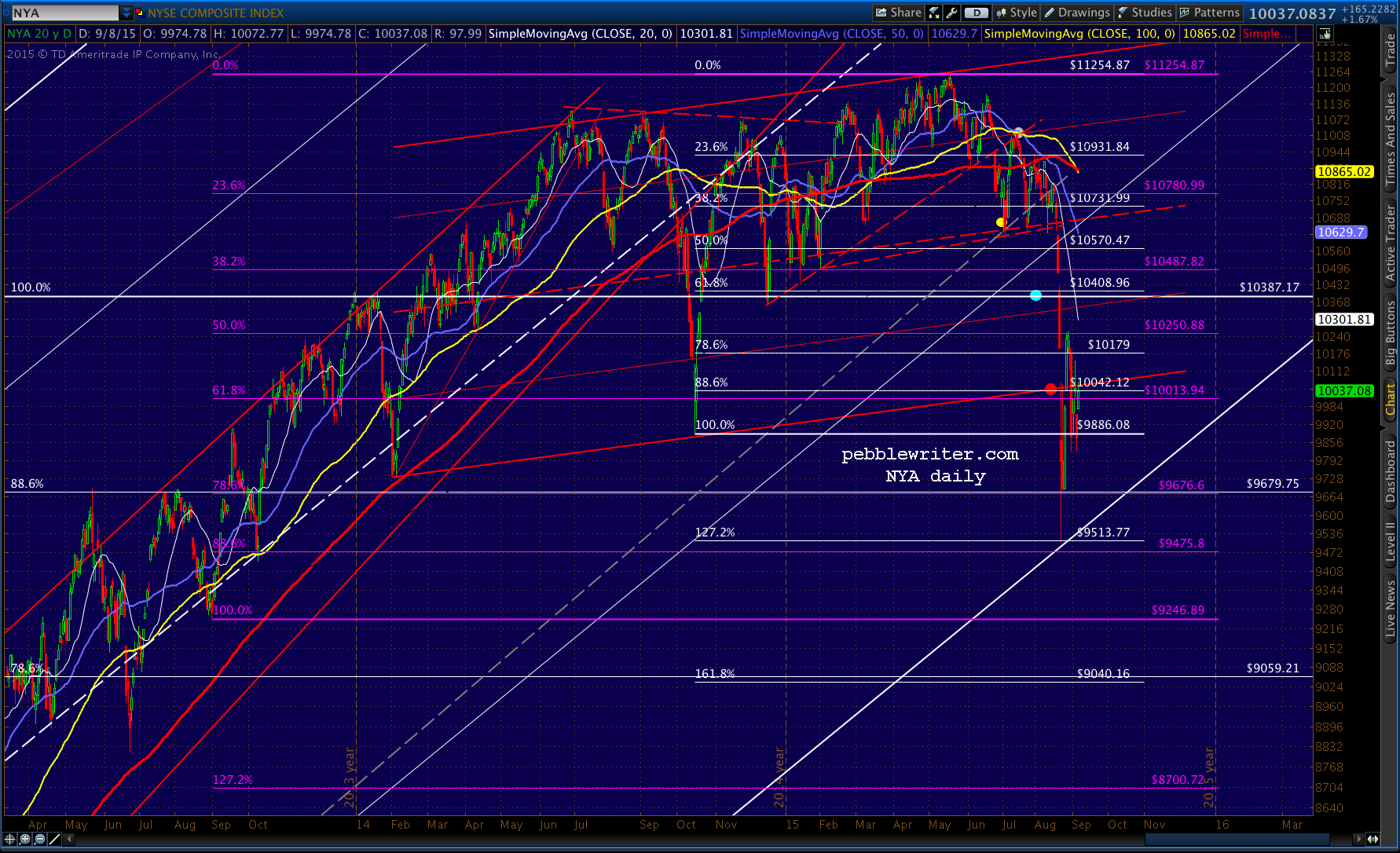 In our July update on NYA, I drew a target at the white .886 Fib line — also the bottom of a channel (red, below) connecting the two previous lows — and pronounced it do or die time for the index.