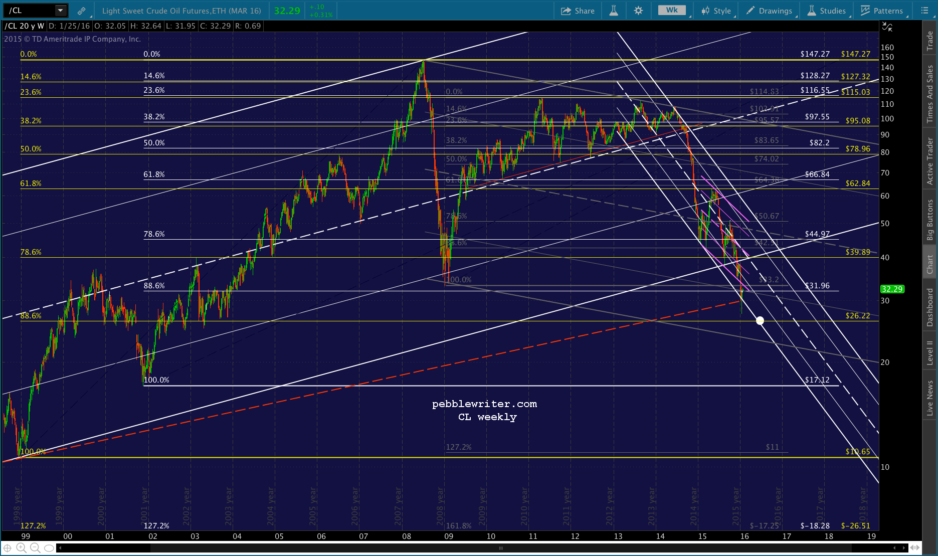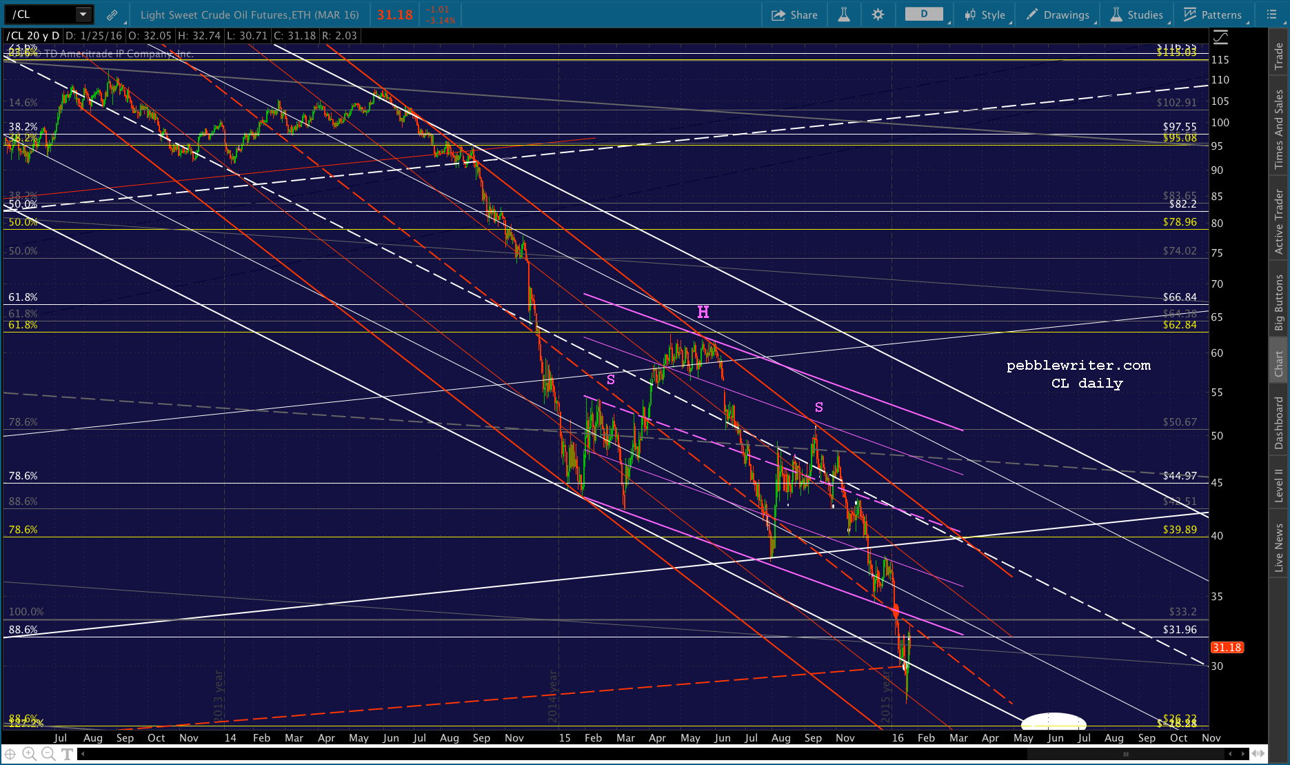 USDJPY needed another leg lower to reach our downside target. So, CL dropped through three additional levels of support, dipping through our 29.61 target before finally getting an unbelievable 18.8% two-day bounce — the equivalent of 3,000 points on the Dow.