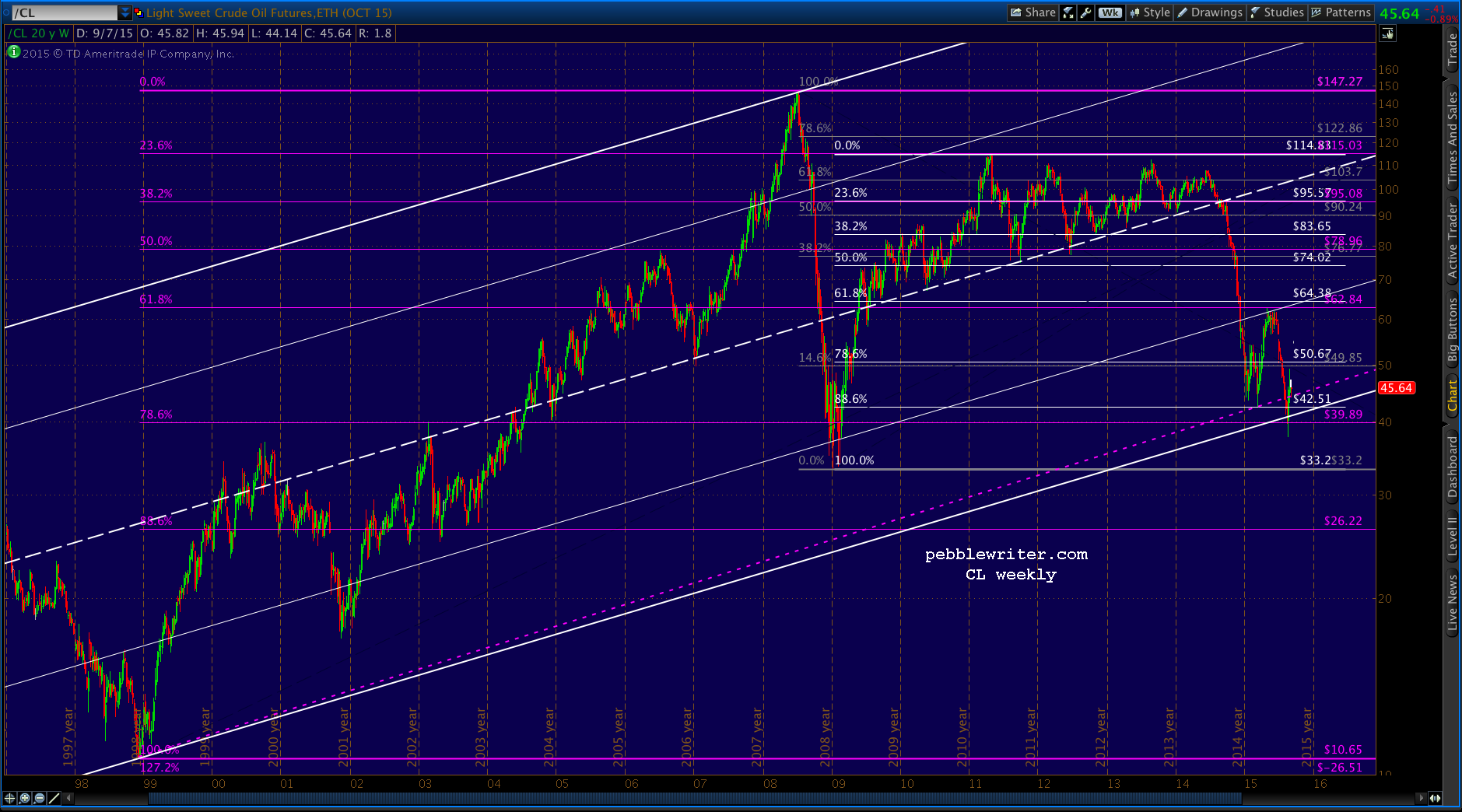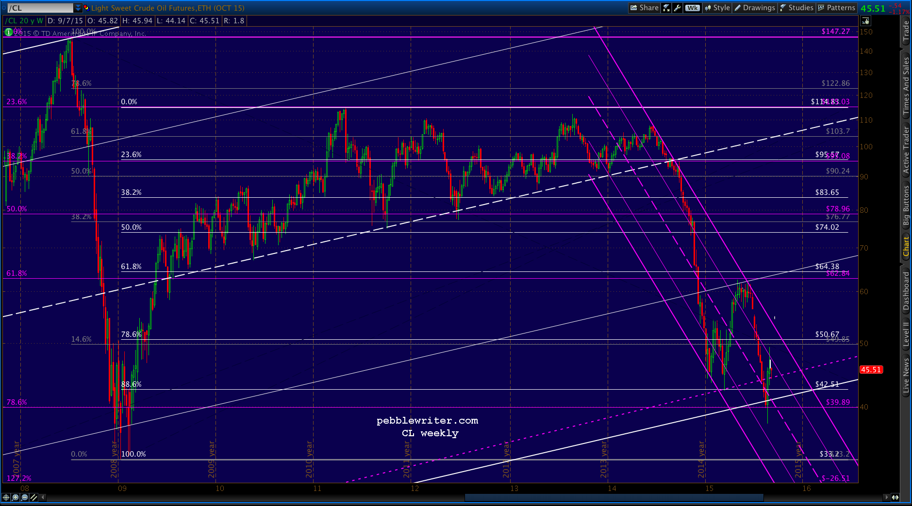 The first upside target, should prices break through the midline, is the purple .618 at 54.45. The intersection with the white channel .786 is around Sep 21. Other targets: the purple .886 (61.7) intersects the white channel top around Sep 11, and the .786 58.99) intersects it around Oct 9.