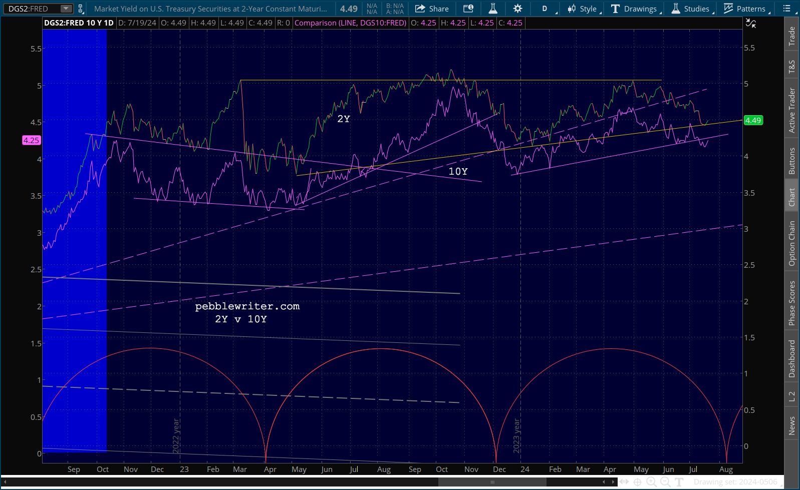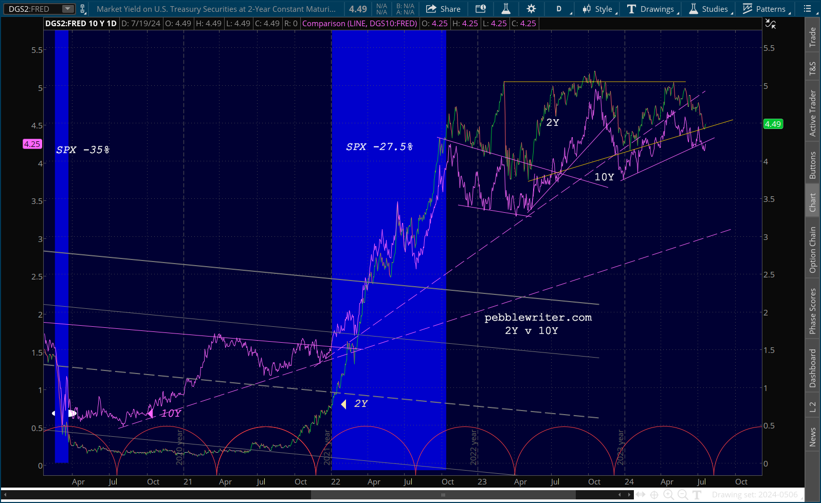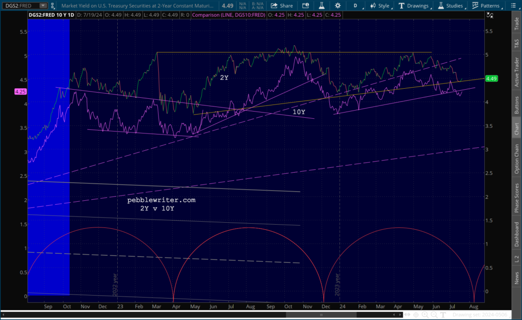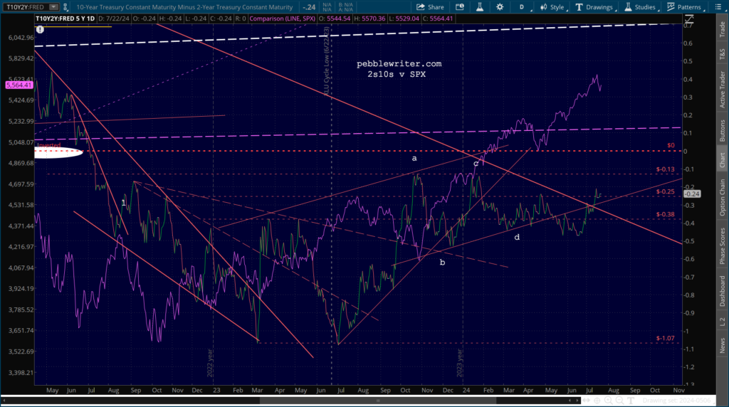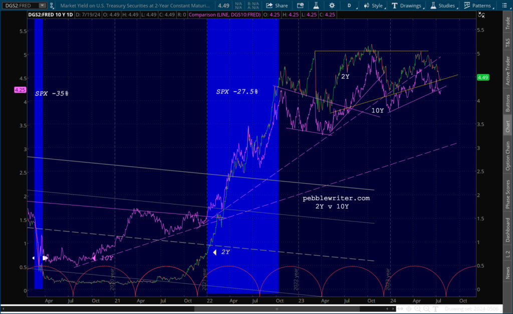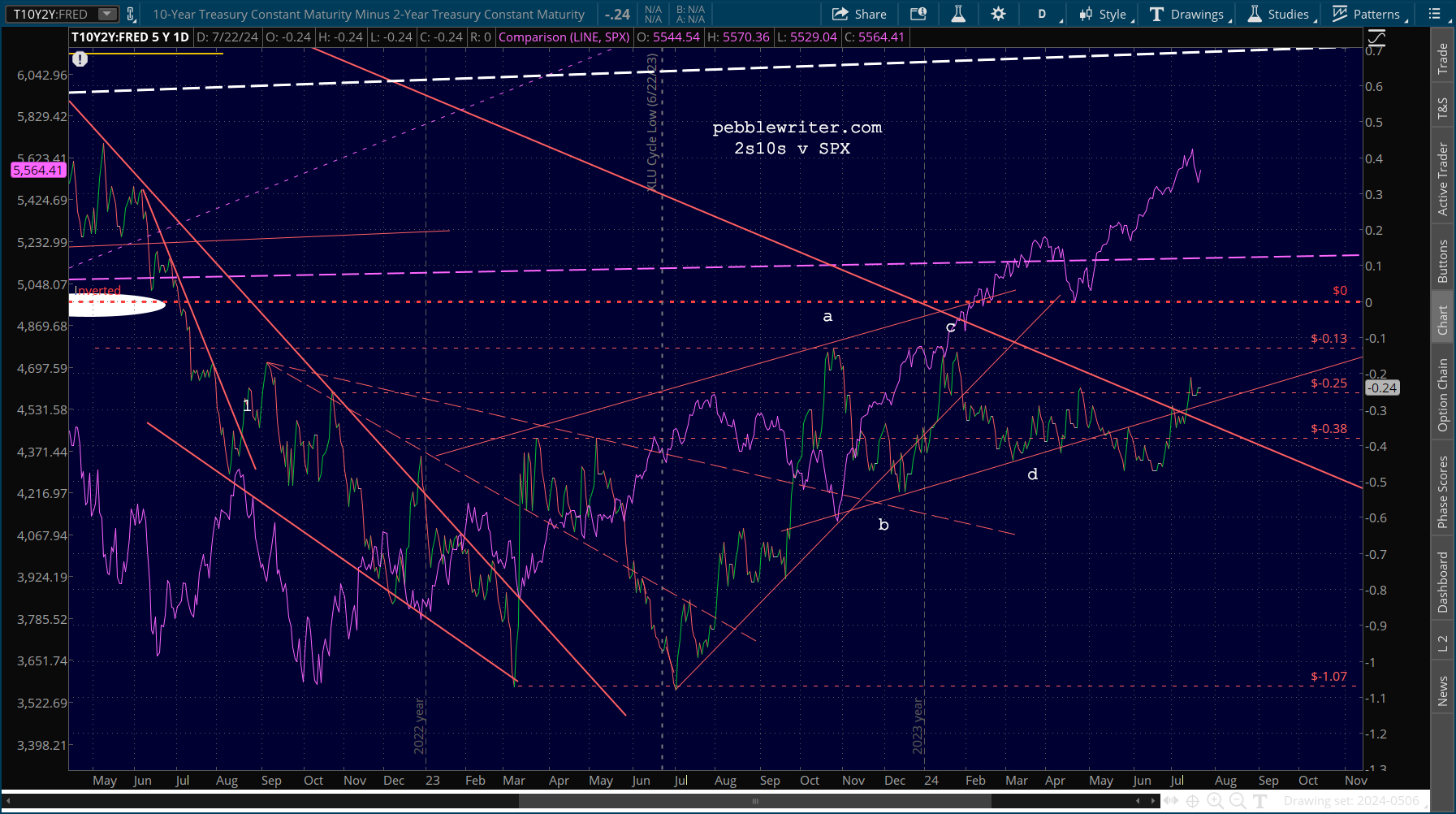 If the 10Y can hold at a backtest of the purple TL and the 2Y continues to bounce at the red TL, then the 2s10s can remain at or below -20 bps.