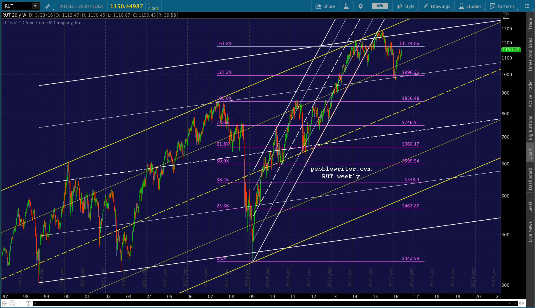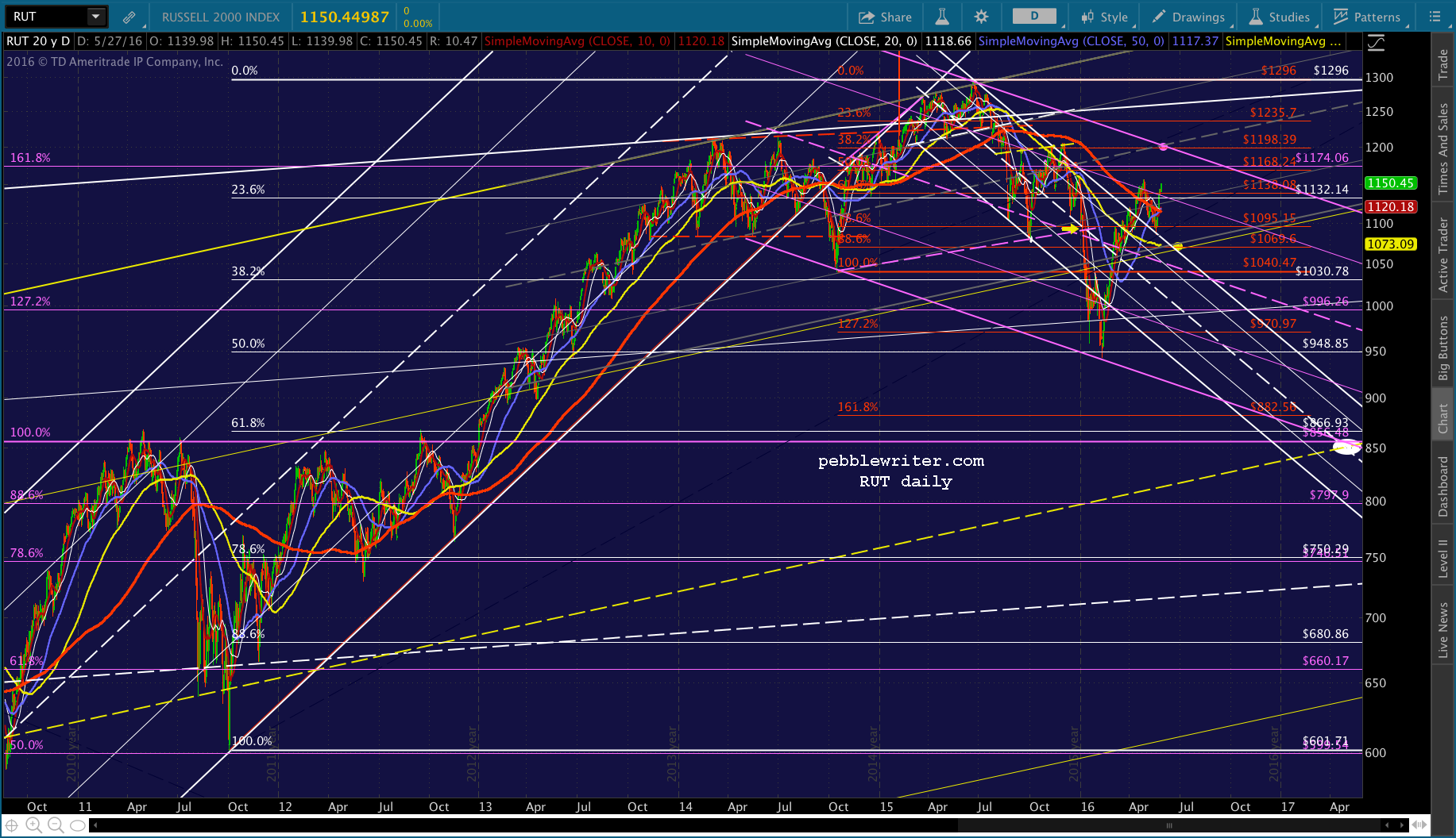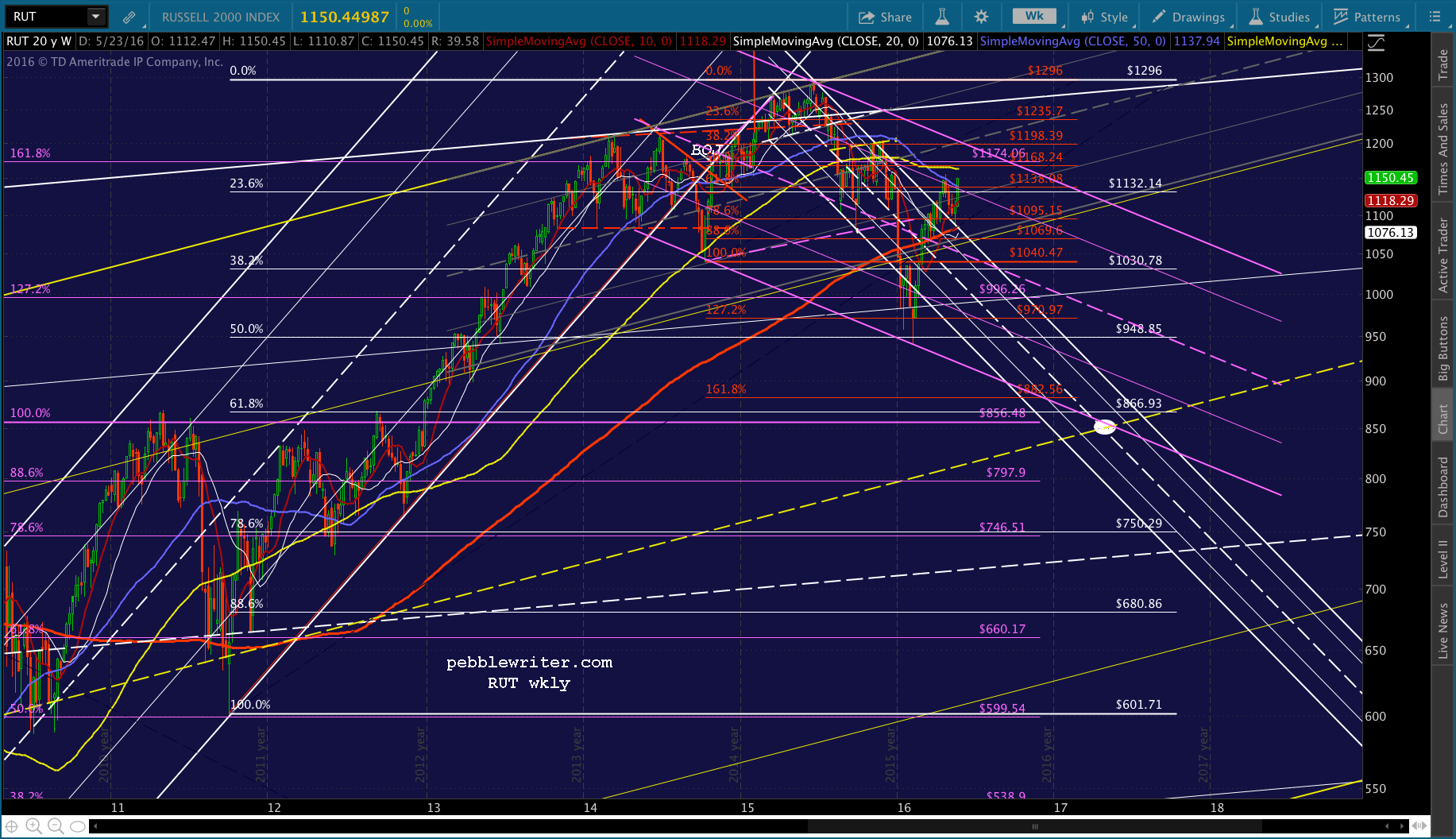 RUT’s long term channel is a good place to start. Like many other indices, RUT should have reversed when it tagged the top of the white and yellow channels at the purple 1.618 in late 2013. (Of course, that was when USDJPY started making noises about heading higher again.)