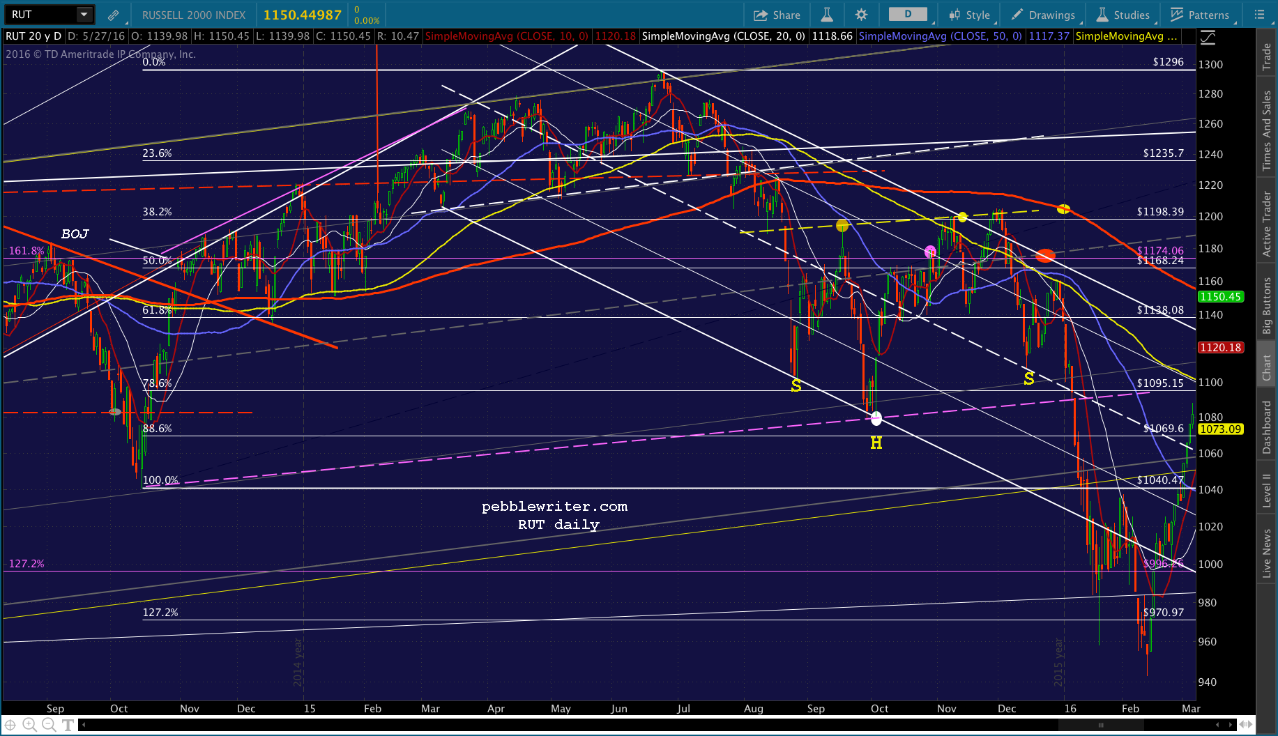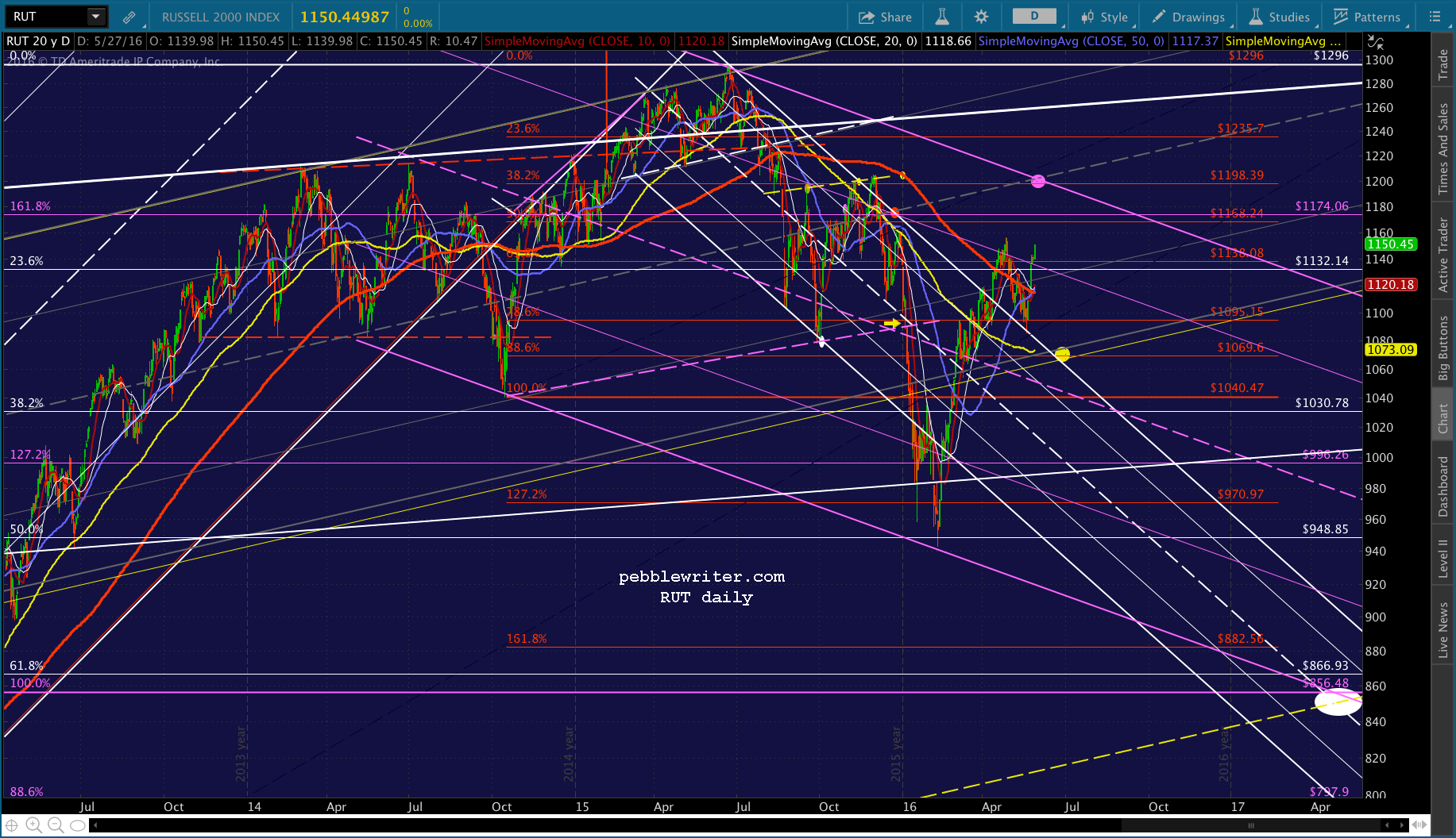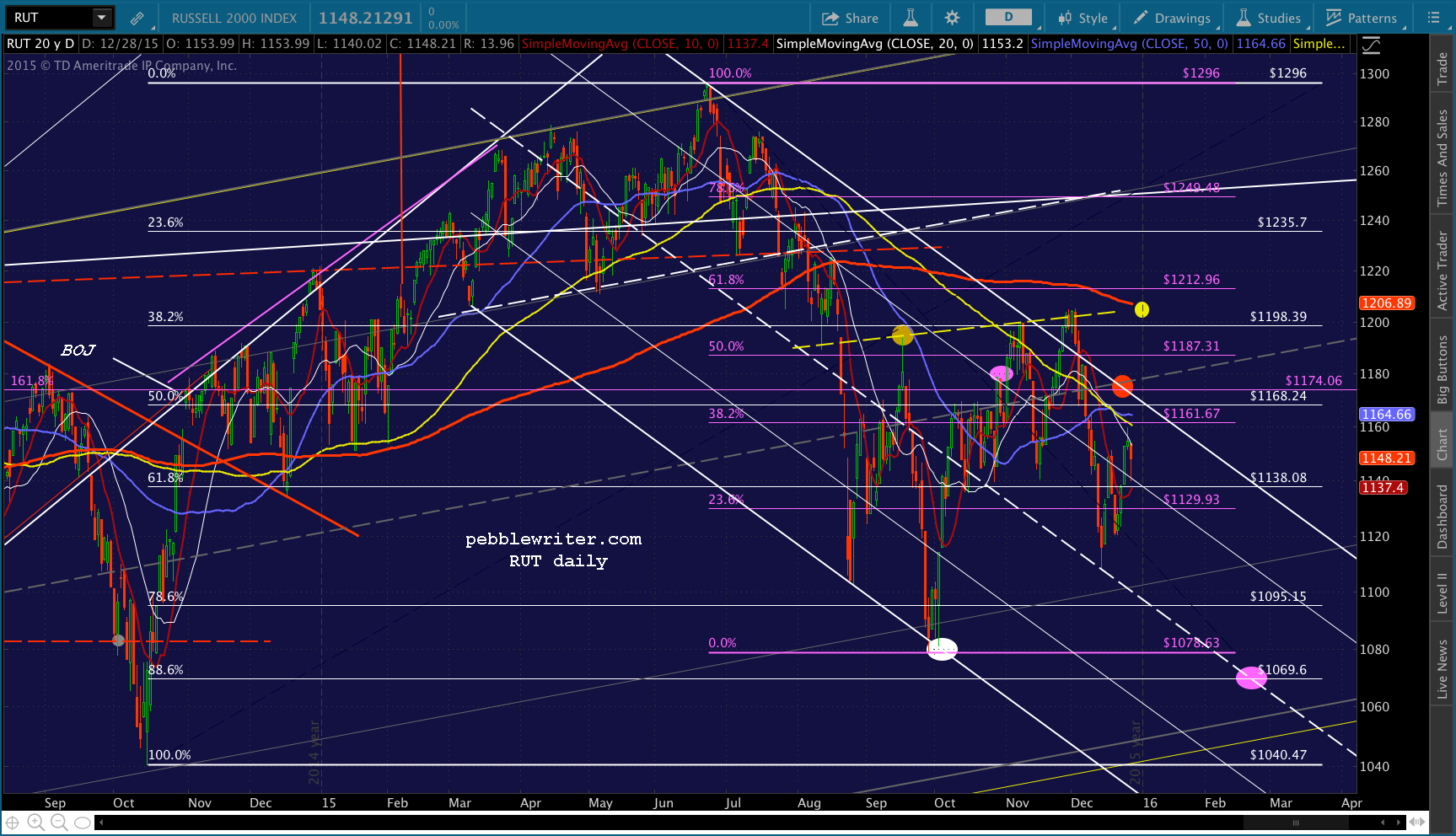 RUT’s long term channel is a good place to start. Like many other indices, RUT should have reversed when it tagged the top of the white and yellow channels at the purple 1.618 in late 2013. (Of course, that was when USDJPY started making noises about heading higher again.)