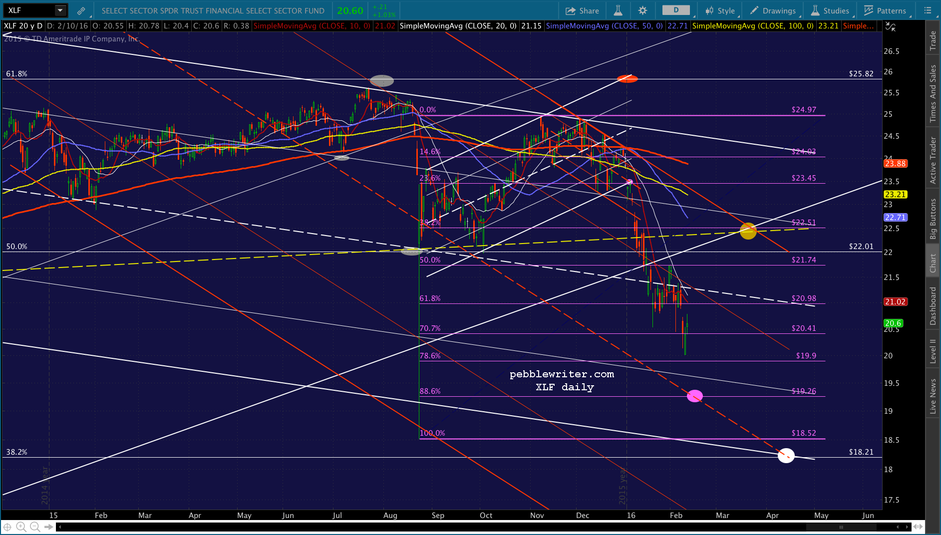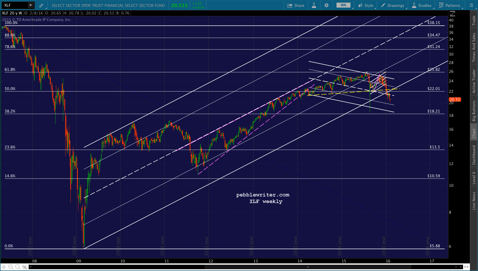 2016-02-10 XLF daily CU 0945continued for membersNote that the drop also took XLF below the bottom of the rising white channel from 2009.  The same thing happened on Aug 24.  But, this time, there was no immediate USDJPY response to boost it back above intraday.  It dropped out of the channel, and has remained there for almost a month.2016-02-10 XLF wkly 0930Looking ahead, I’ve identified a few potential targets.  It think the next downside target has to be the purple .886 at 19.26 where it intersects with an expanded falling red channel midline in the next couple of days.