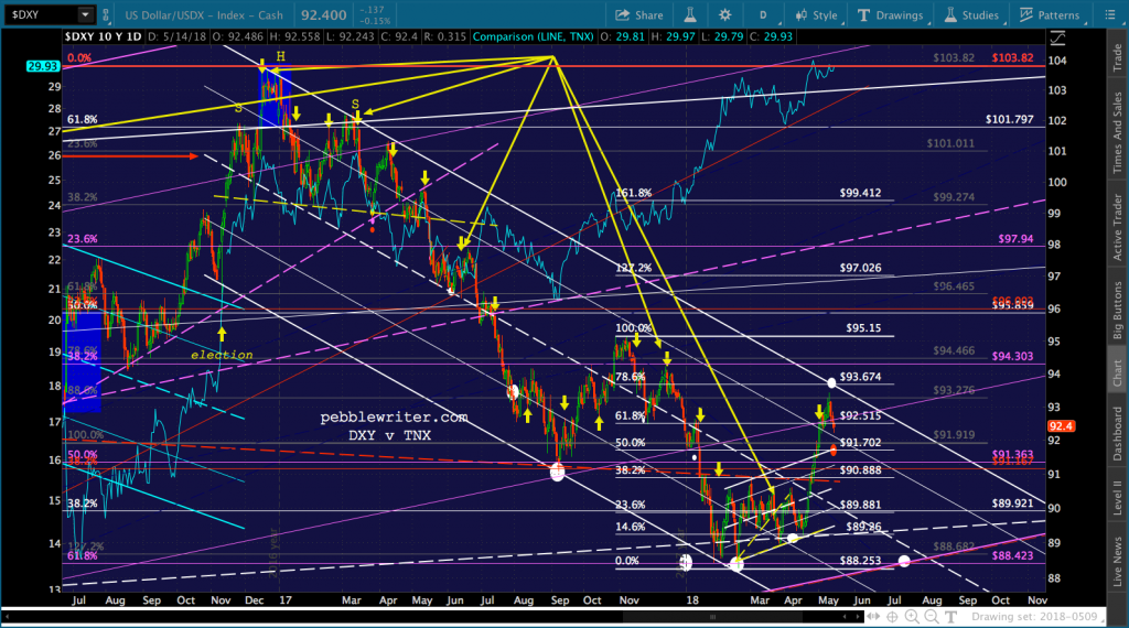 There are very few charts which tell the story of this market as dramatically as does VIX’s. The most noticeable pattern is the falling purple channel which accurately signaled its highs and lows between Nov 2015 and Jan 2018. But, this falling channel conflicted with a much larger rising yellow channel.