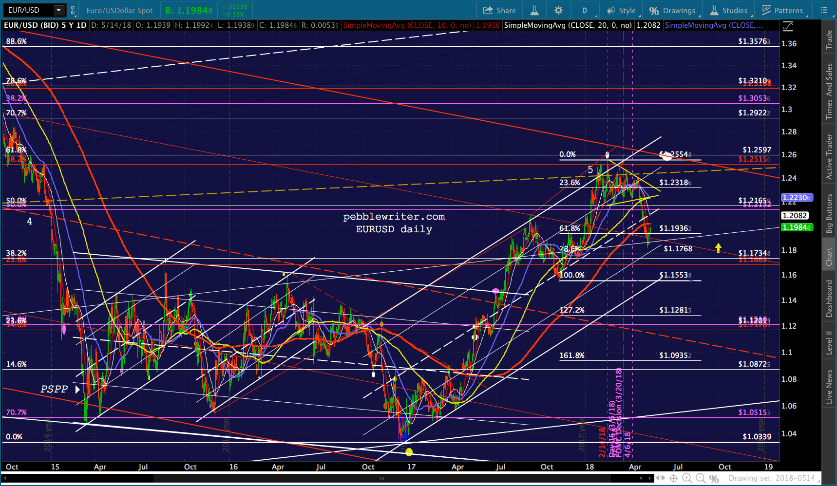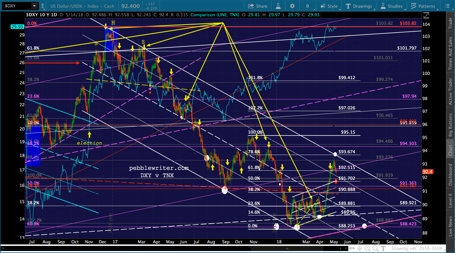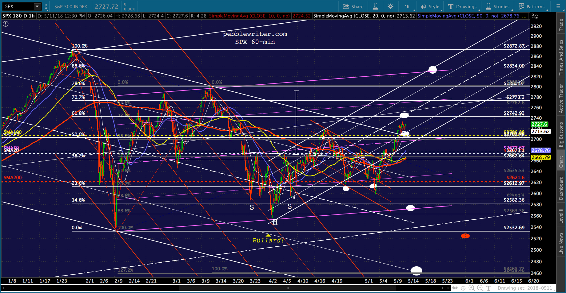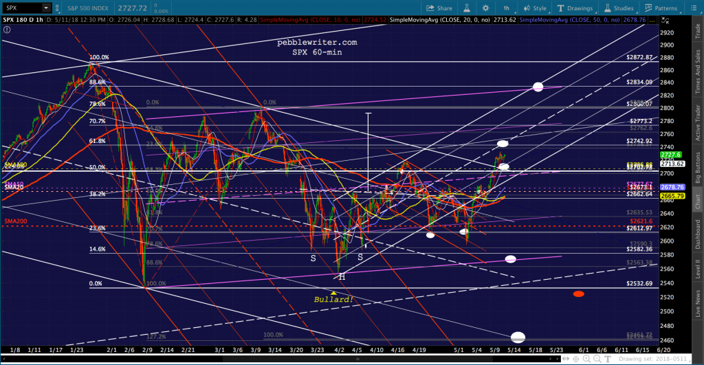 Suddenly, in February 2018, VIX exploded out of the falling purple channel and retraced a Fibonacci .886 of its drop from the Aug 2015 highs — resulting in an 11.8% correction for SPX in only 6 trading days. SPX would go on to test its 200-day moving average — something it hadn’t done since the US election — eight times between Feb 9 and May 3.