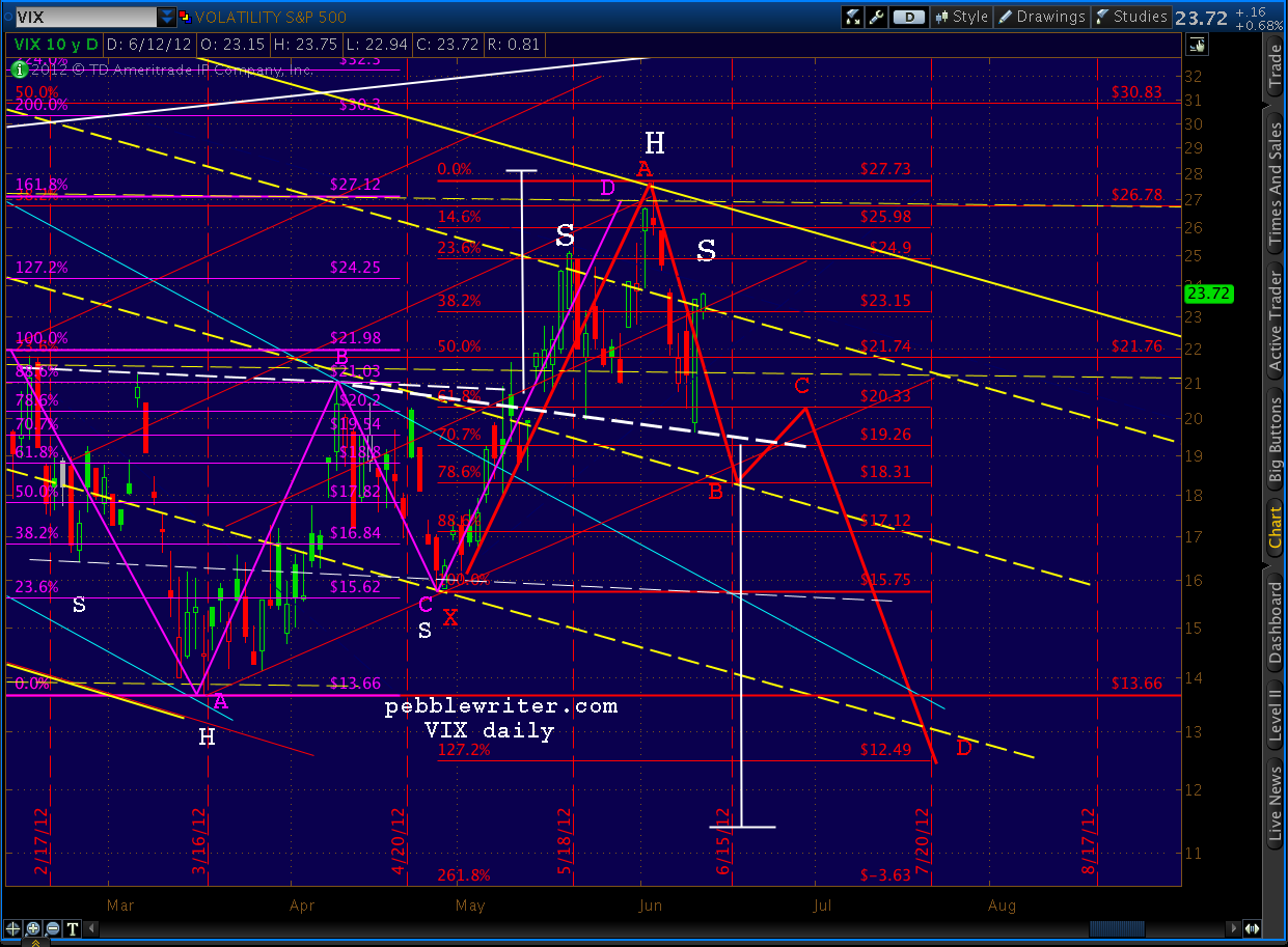 A tag of 18.31 will constitute a Point B in a Butterfly Pattern (in red above), the completion of which will be 12.49. This comes in reasonably close to the H&S target of 11.40 — which I don’t believe we’ll quite hit. Looking closely, there’s a channel line and a long-term TL that intersect right around 12.49 in the vicinity of July 20 — our target date for the next equity high.