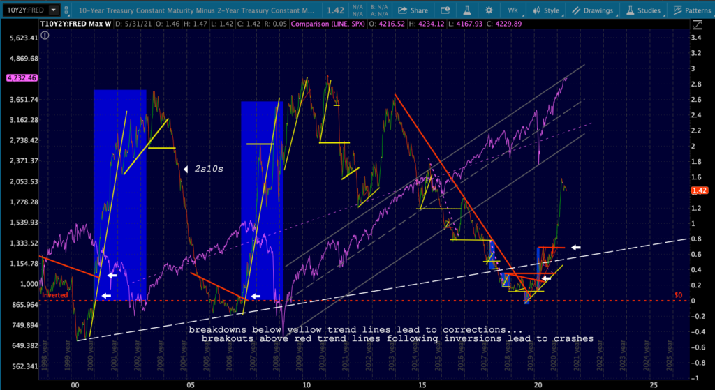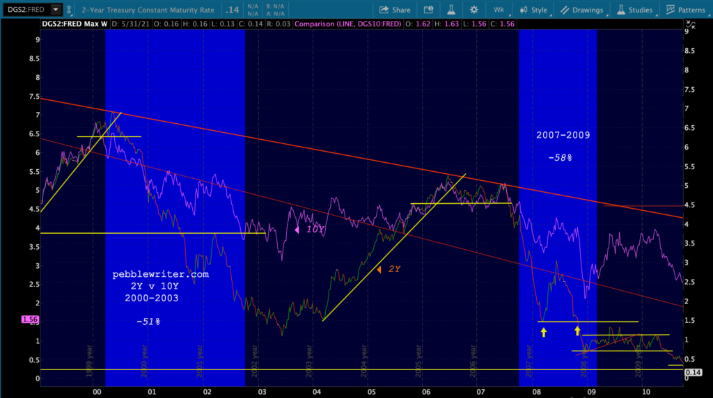 The previous ones in 2000-2003 and 2007-2009 were produced simply by a faster plunge in the 2Y than the 10Y. The suddenly widening gap produces a spike in the 2s10s.