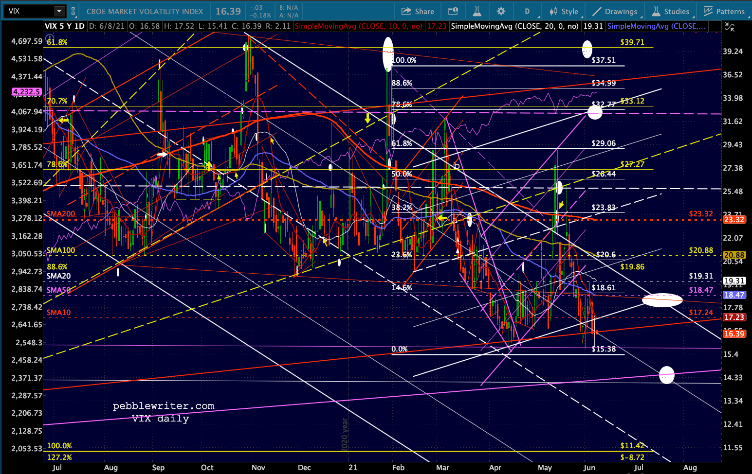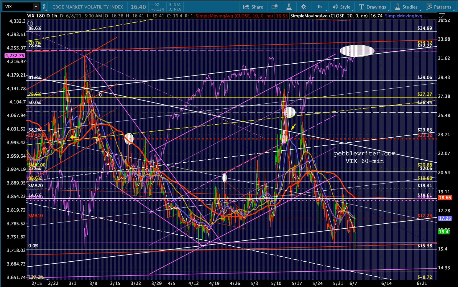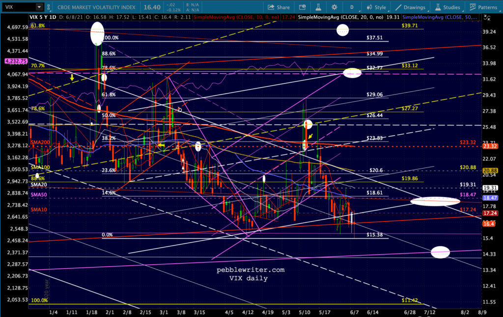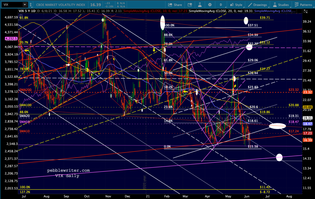 VIX’s collapse continues, putting ES within a few points of its all-time highs. At 15.15, VIX has given up nearly 50% since its May 13 highs and has reached the lowest level since Feb 20, 2020 – just before its ascent to 85.47 less than a month later.