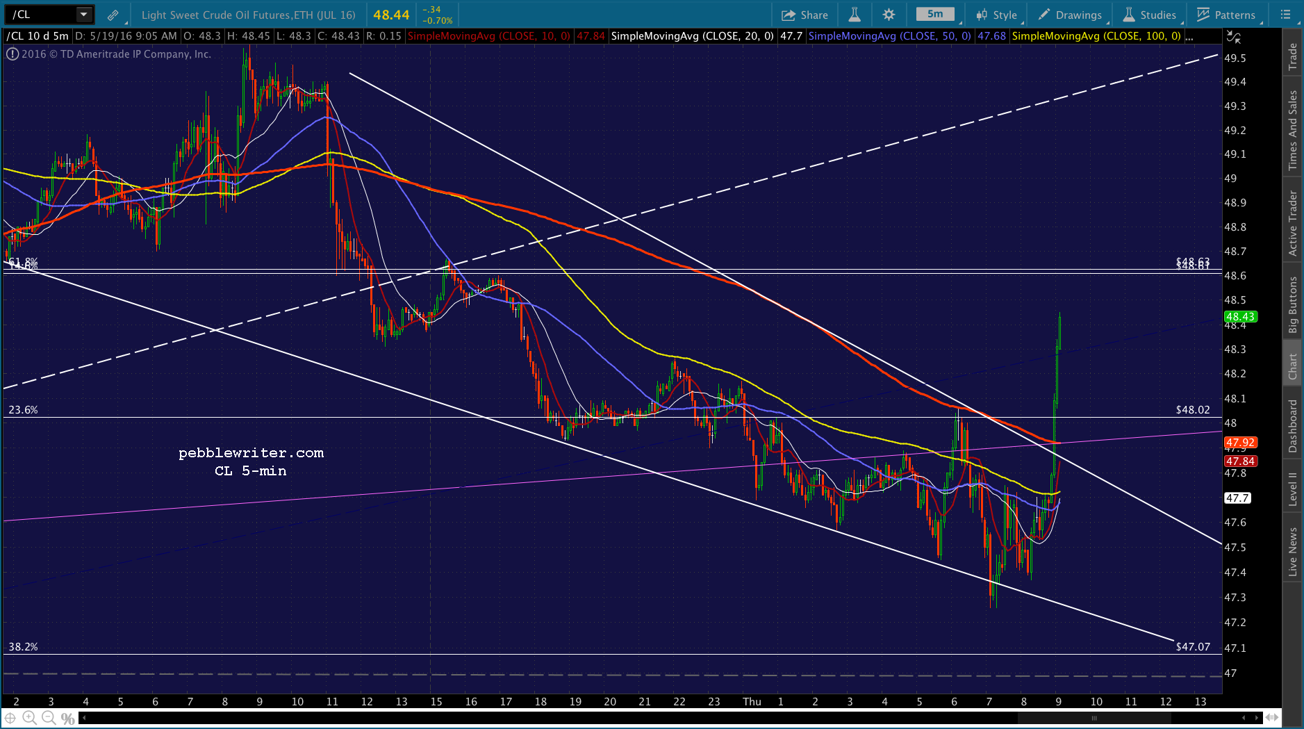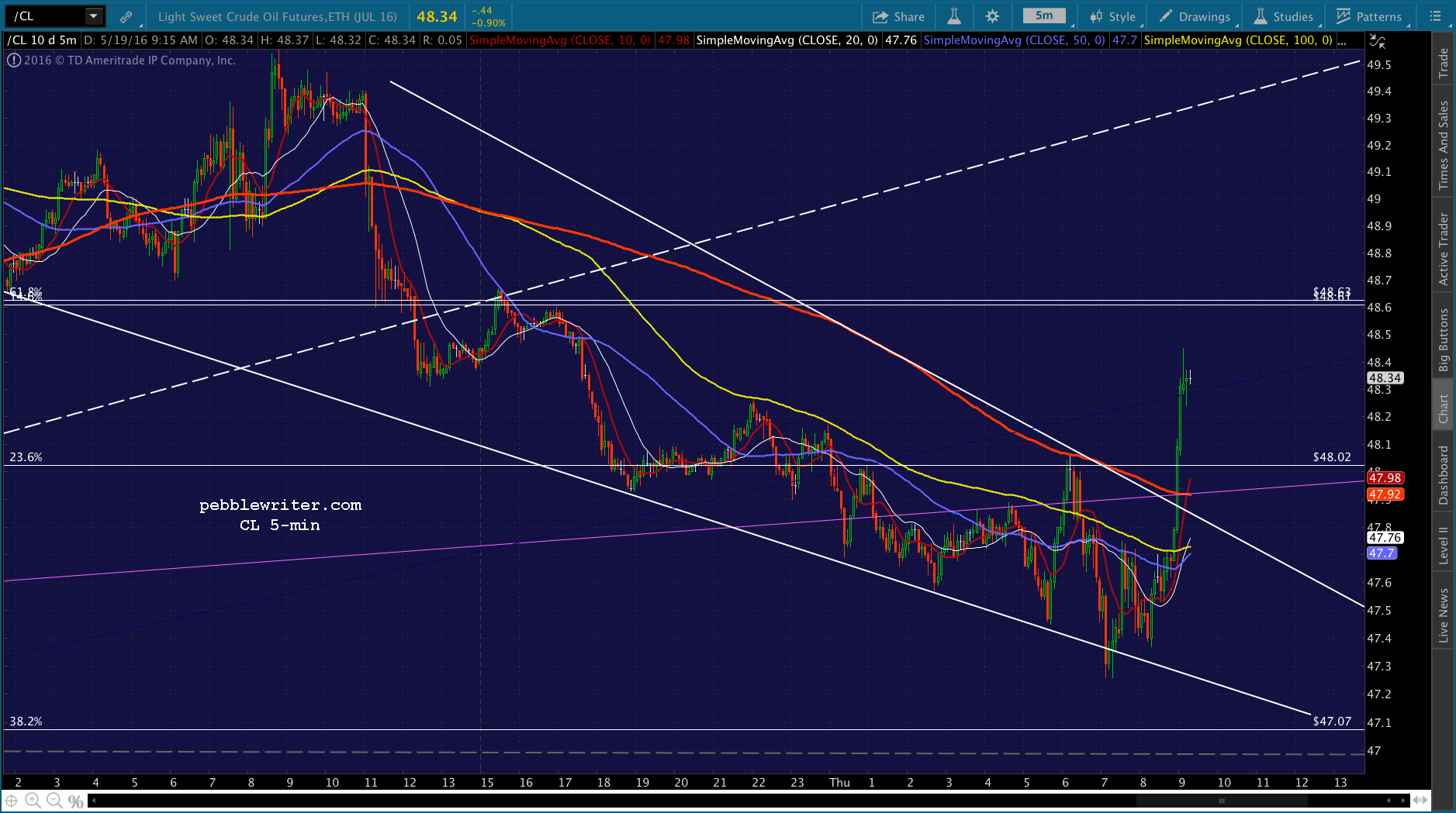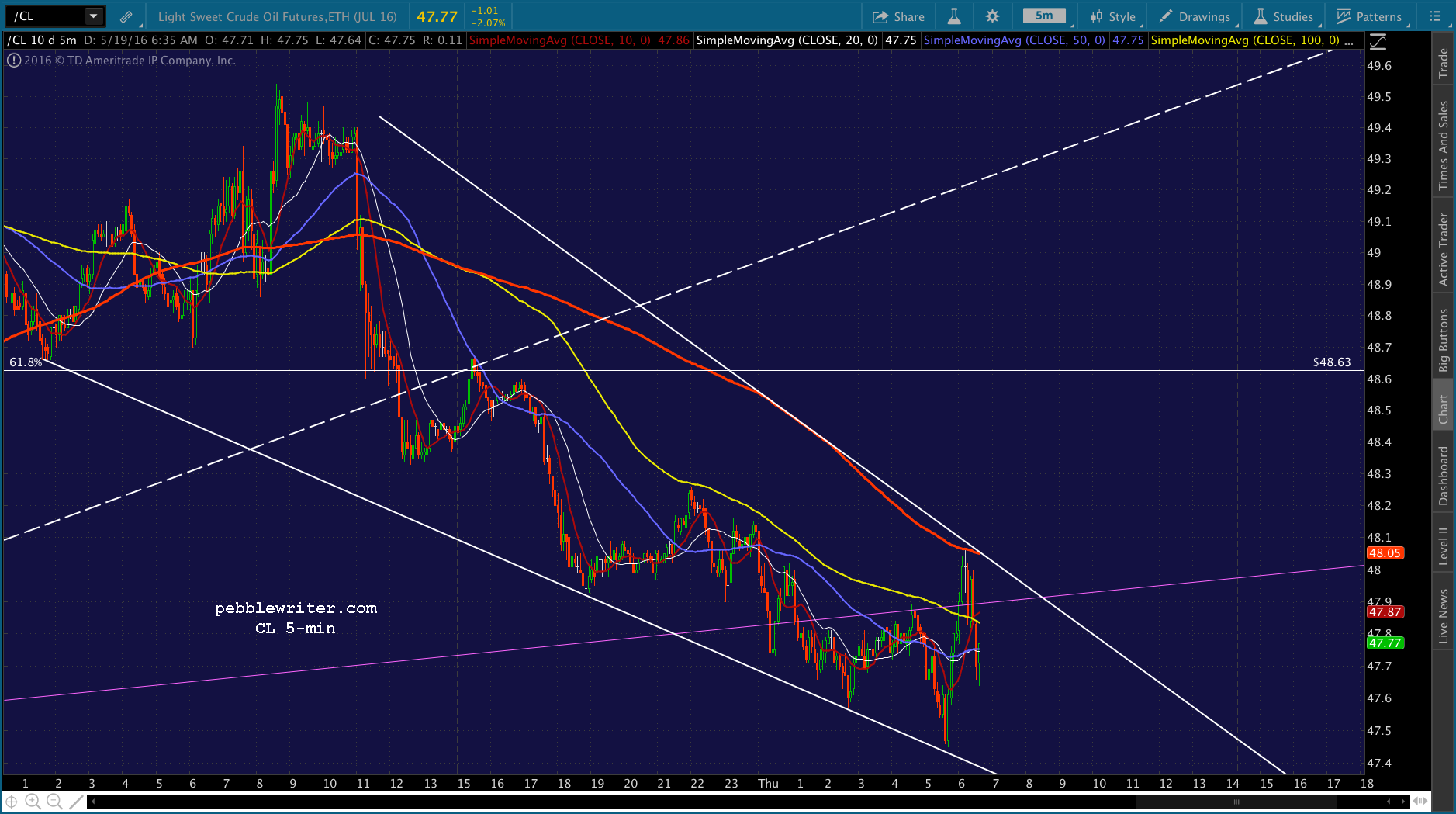 CL just backtested the .618 at 48.63, and SPX tagged the SMA5 100, and ES the white TL. So, the state is set for a decline here, except for USDJPY — which looks bound for the SMA5 200 at 110.00. Shorting here with low expectations and very tight stops.
