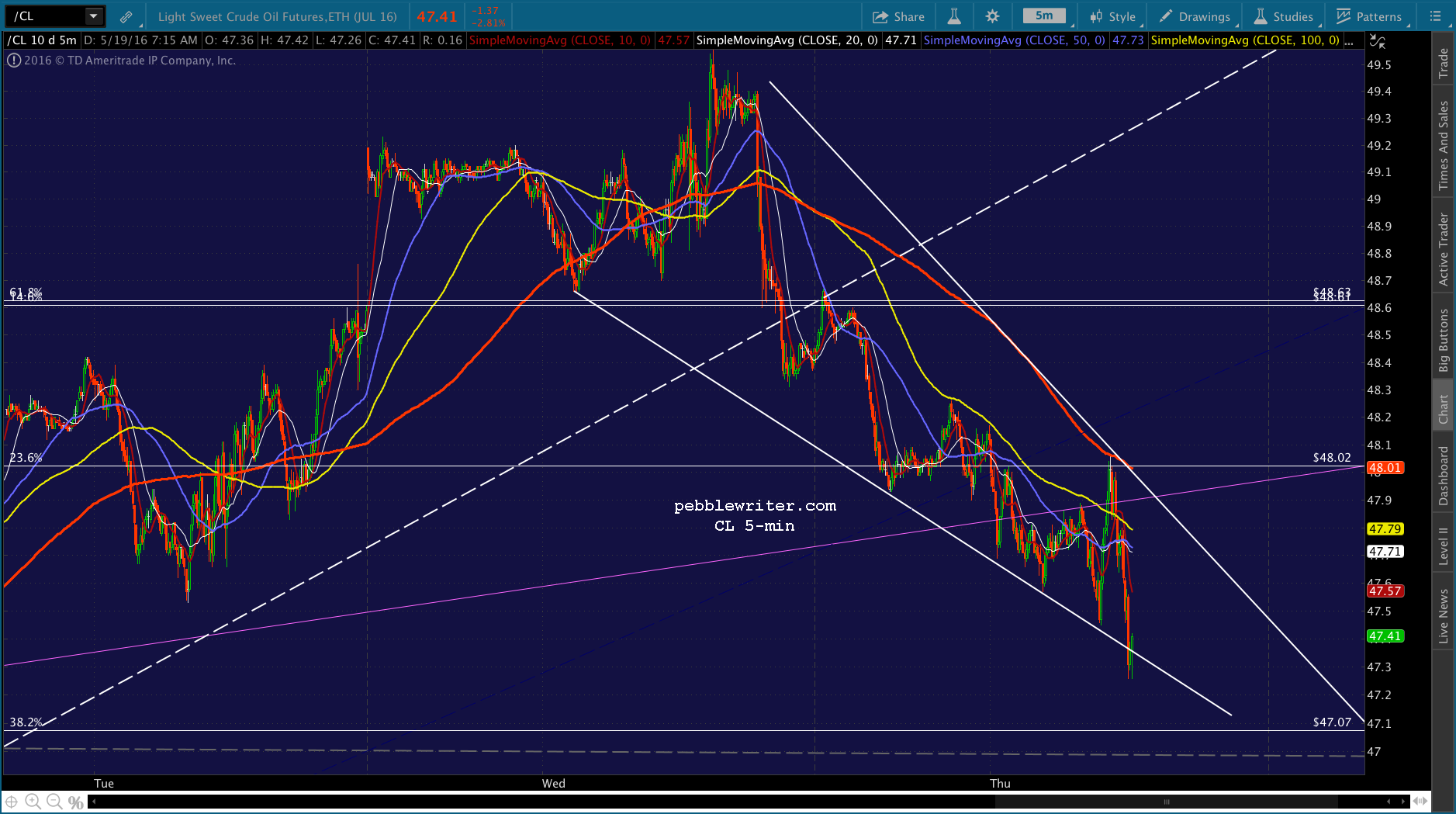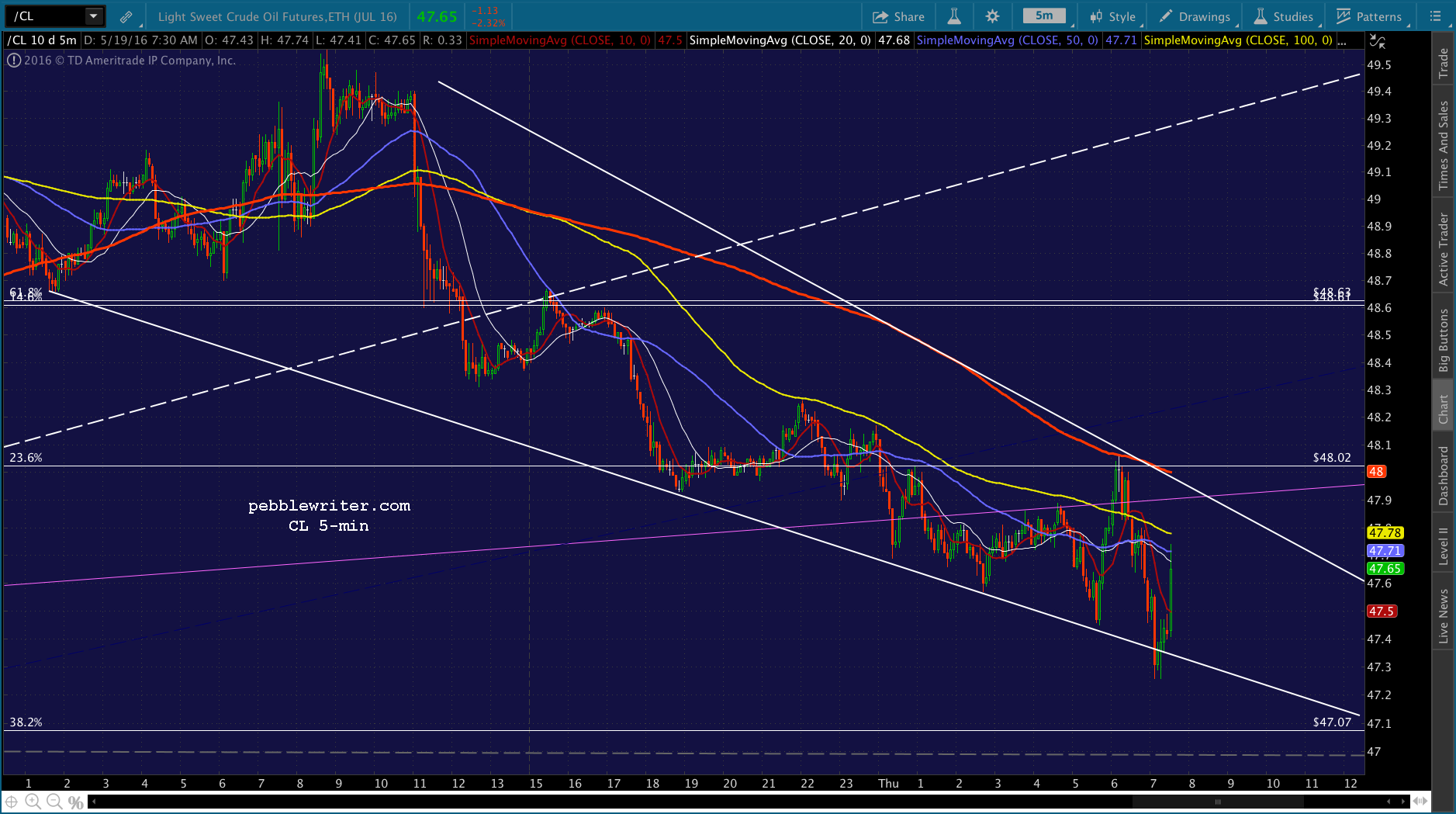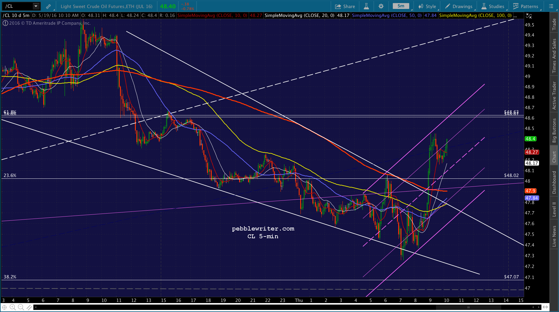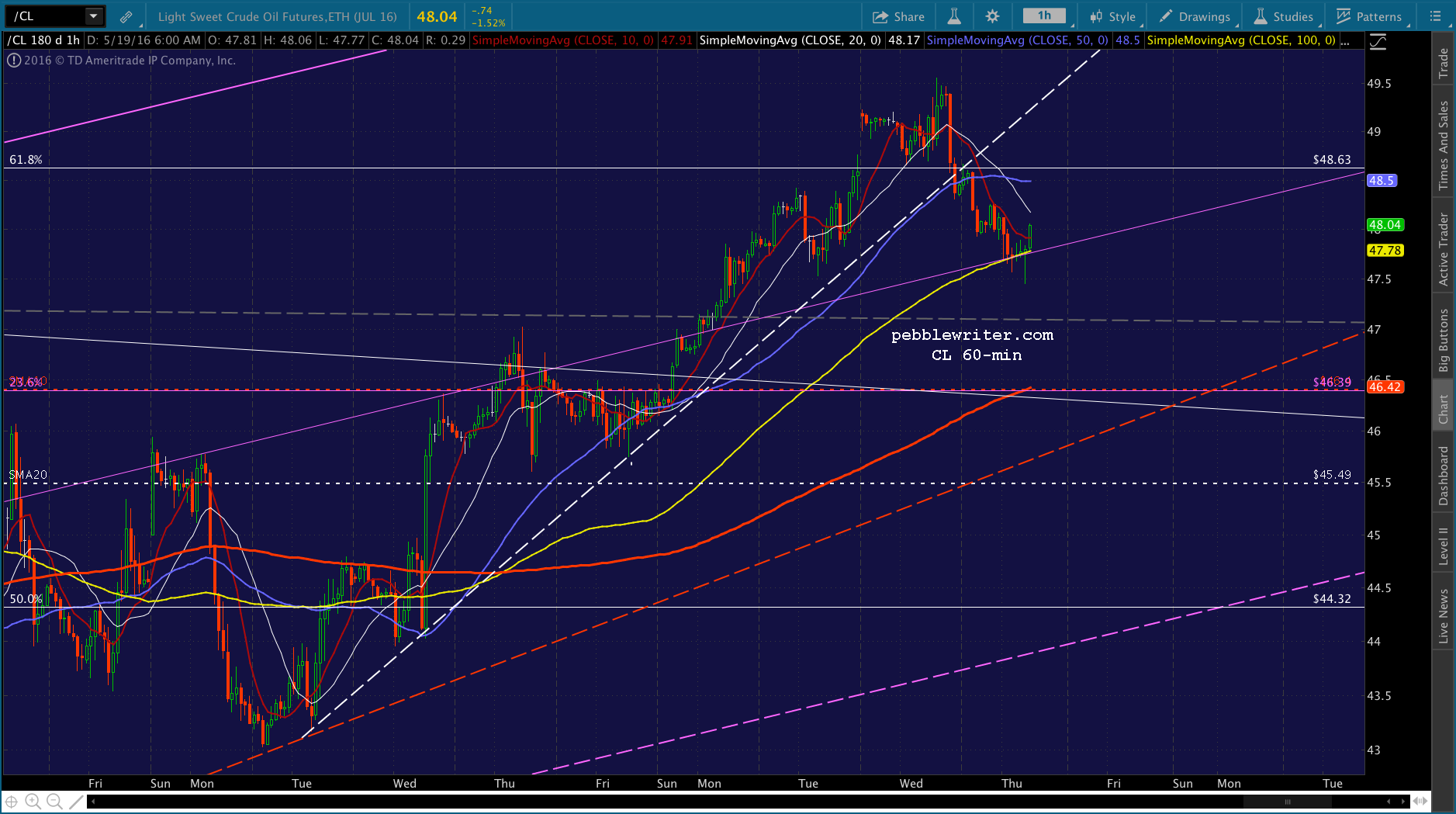CL just backtested the .618 at 48.63, and SPX tagged the SMA5 100, and ES the white TL. So, the state is set for a decline here, except for USDJPY — which looks bound for the SMA5 200 at 110.00. Shorting here with low expectations and very tight stops.