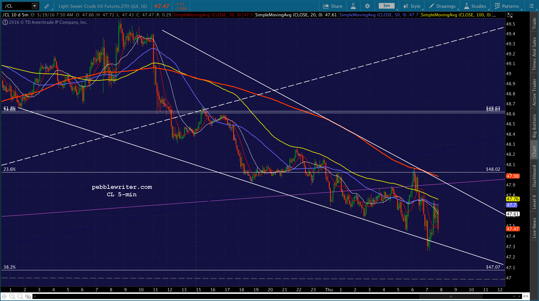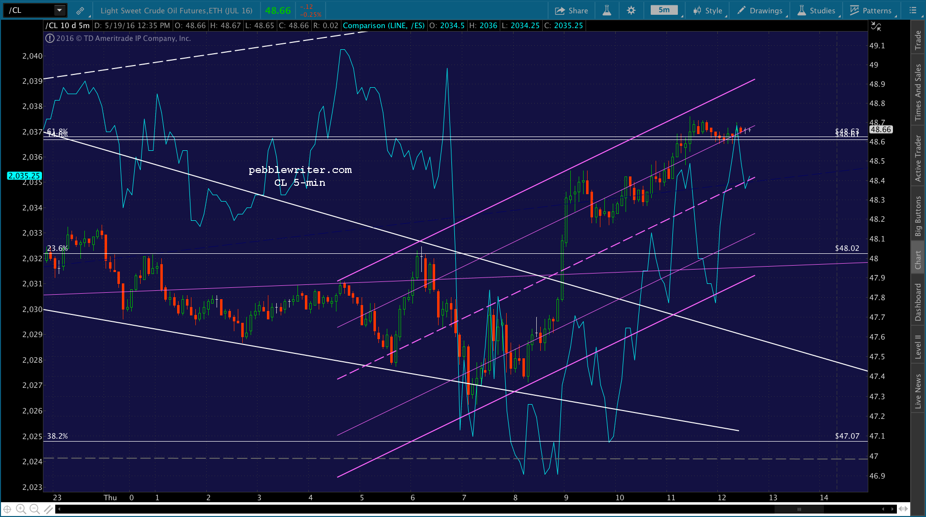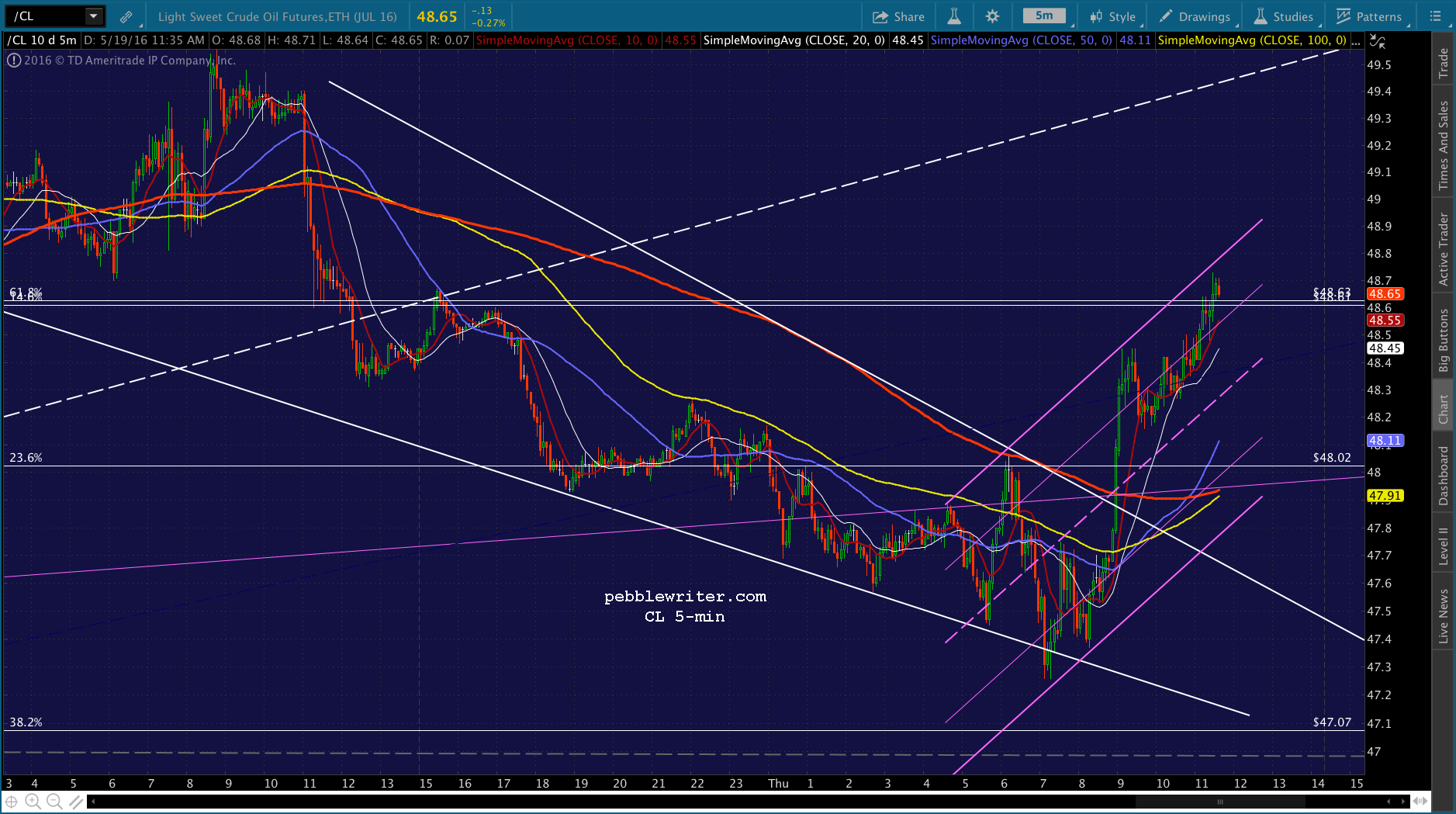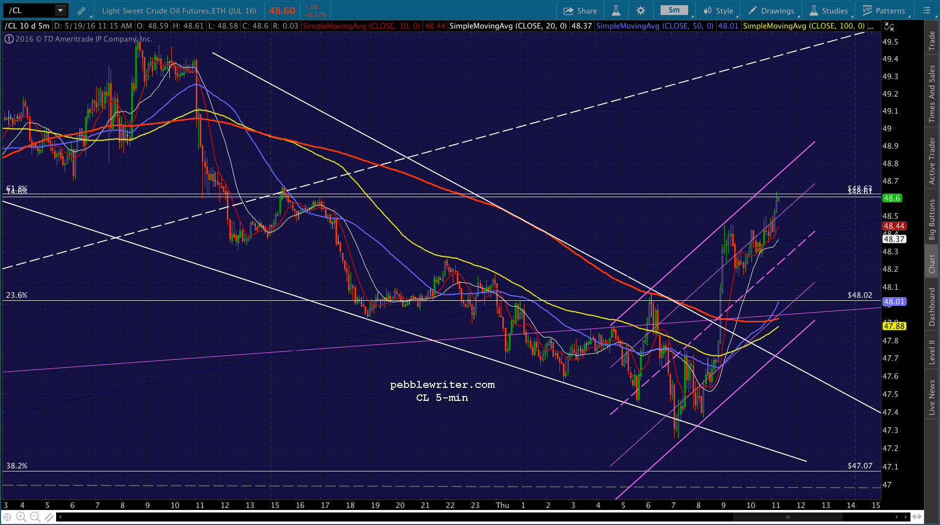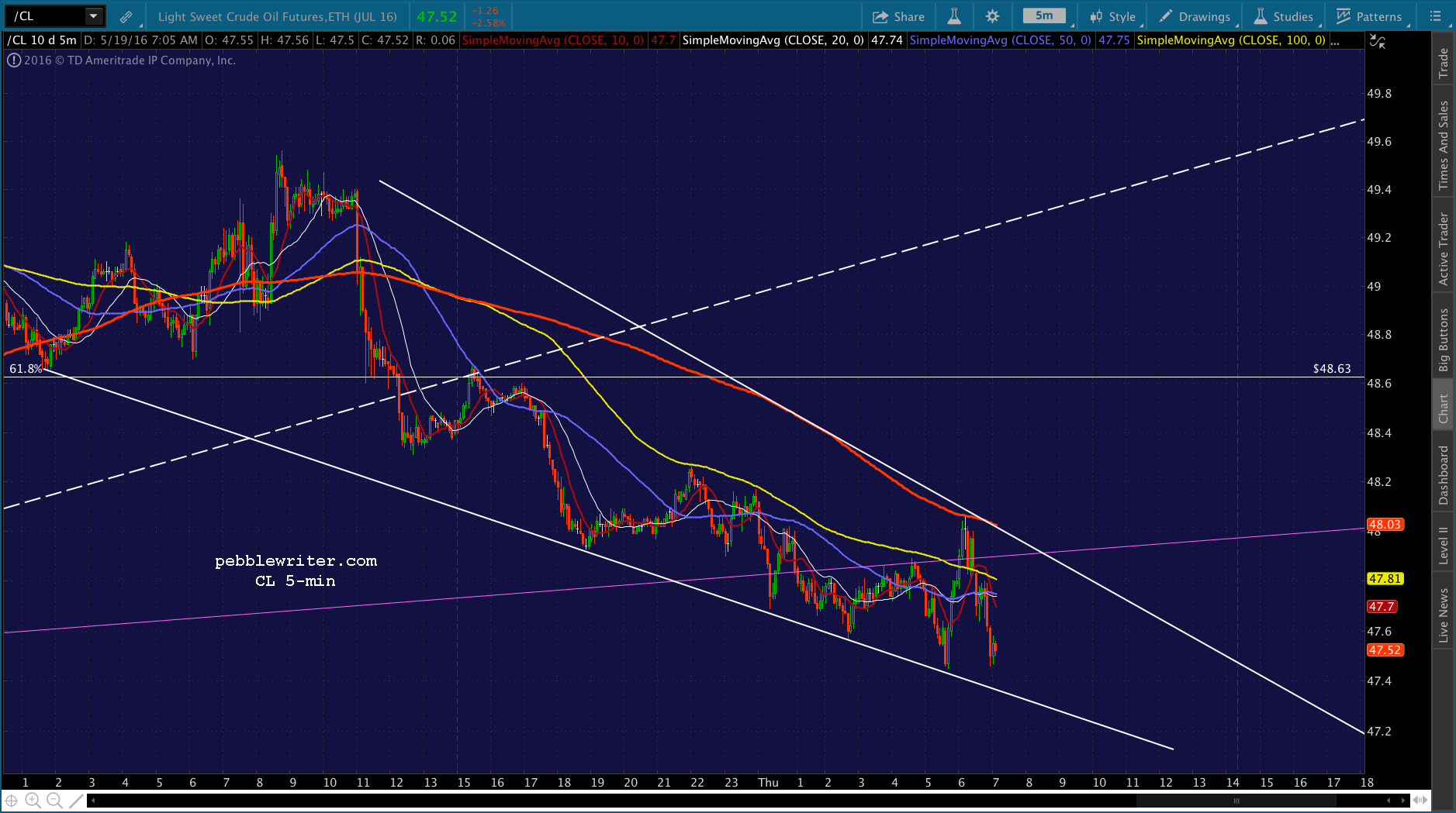 Well, it’s 1:15 and SPX is rallying, not diving. Thank CL for that. On the bright side (for bears) SPX is approaching the SMA5 50, which might provide the impetus for a decline. On the not so bright side, CL appears headed for the .618 at 48.63. Ideally, it would reverse here and backtest the white TL at the bottom of the rising purple channel. Stay tuned…
