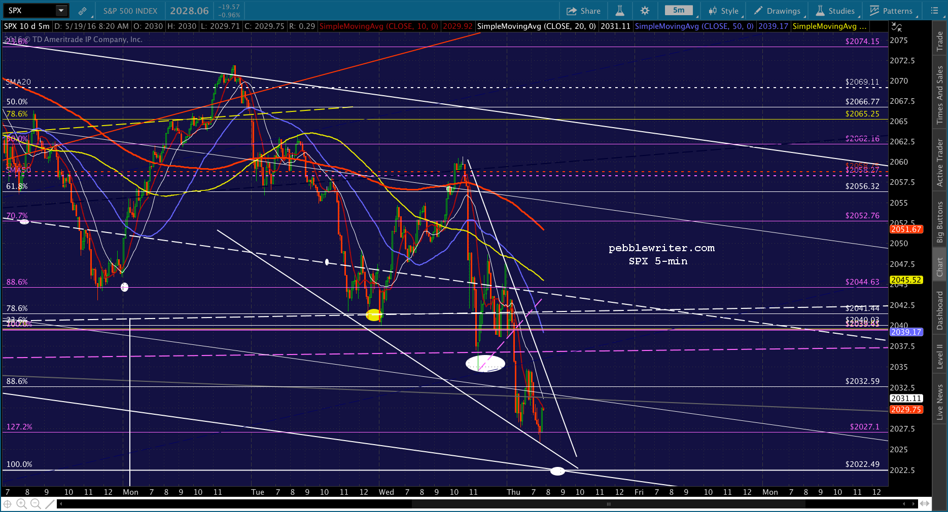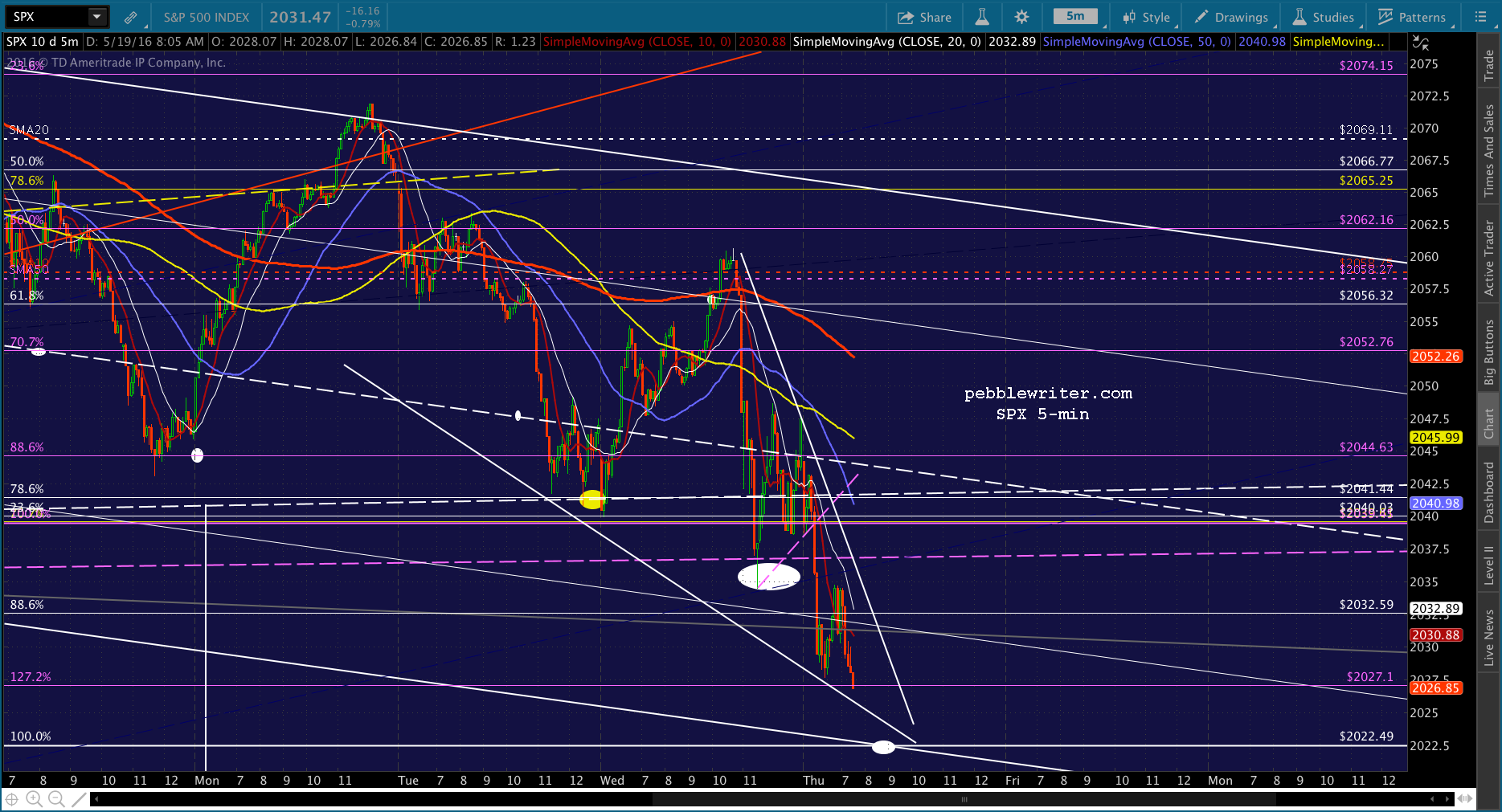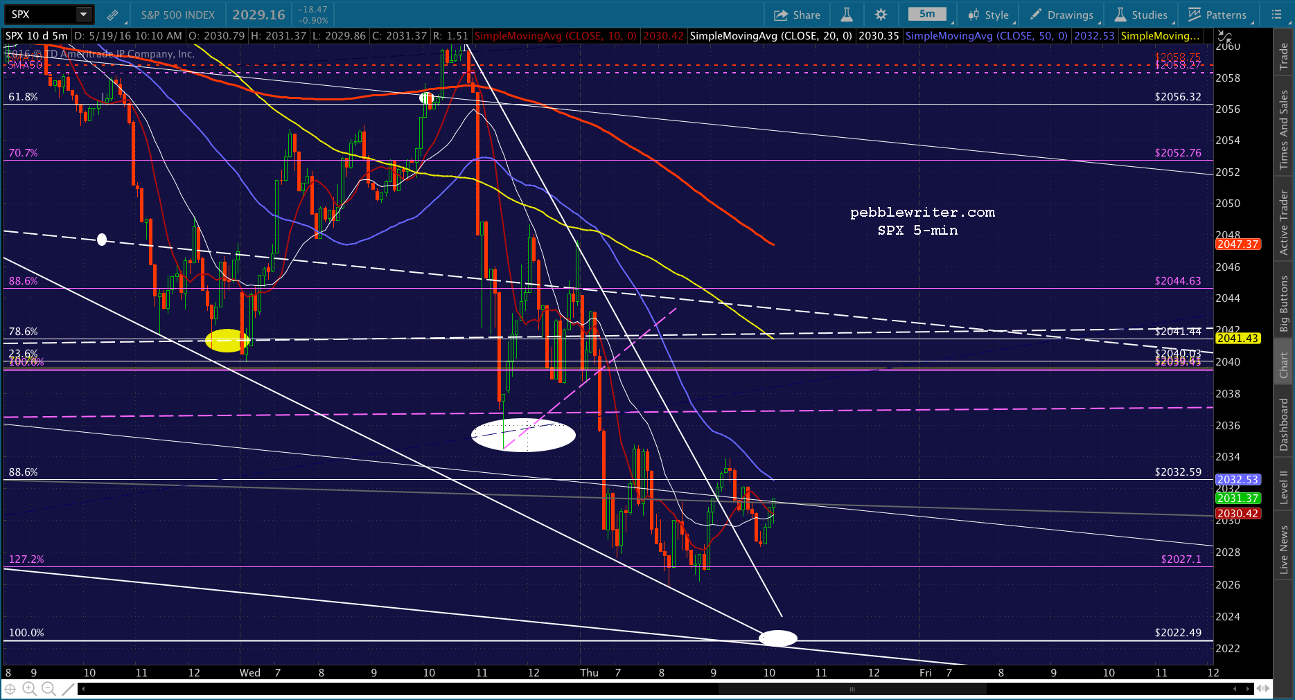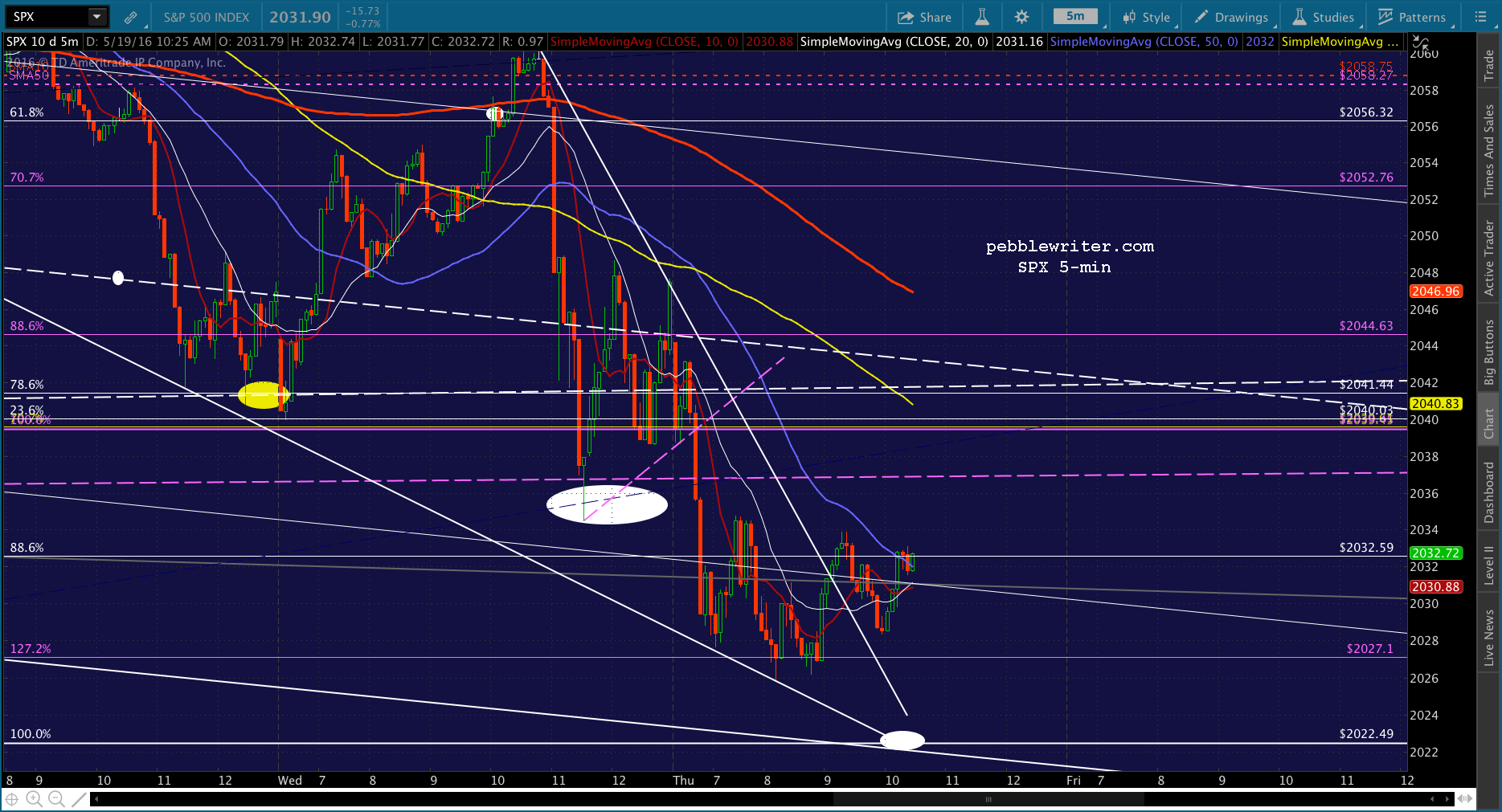 If the dot is placed correctly, SPX will tag it around 1:15 PM. We might bet another spurt up to the SMA5 50 at 2033, at which point we’ll have another shot at a 10-12 pt short. Or, it might just drop through support here and head for 2022 right away. Hard to say, though I’m okay taking a flyer on here and now. Back to short.