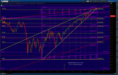 I think it’s important to realize that the big, red rising wedge is still hanging out there, drawing prices higher for at least one last tag. It intersects with the apex of the yellow wedge, somewhere between 1460 and 1470 and between May 7-11 (the range results from having to consider/ignore the impact of shadows on earlier peaks and bottoms.)