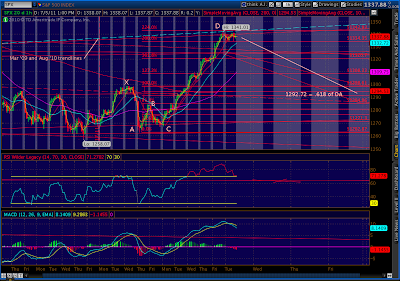 The initial target of a Crab Pattern is the .618 retrace of the AD leg. Here, that translates into 1292.72. Subsequent targets include a 1.272 retracement of AD at 1242 and a 1.618 retracement at 1214. (As I mentioned in this weekend’s post, I suspect the initial drop will stall by 1299 in order keep alive the hopes of a wave 5 up.)