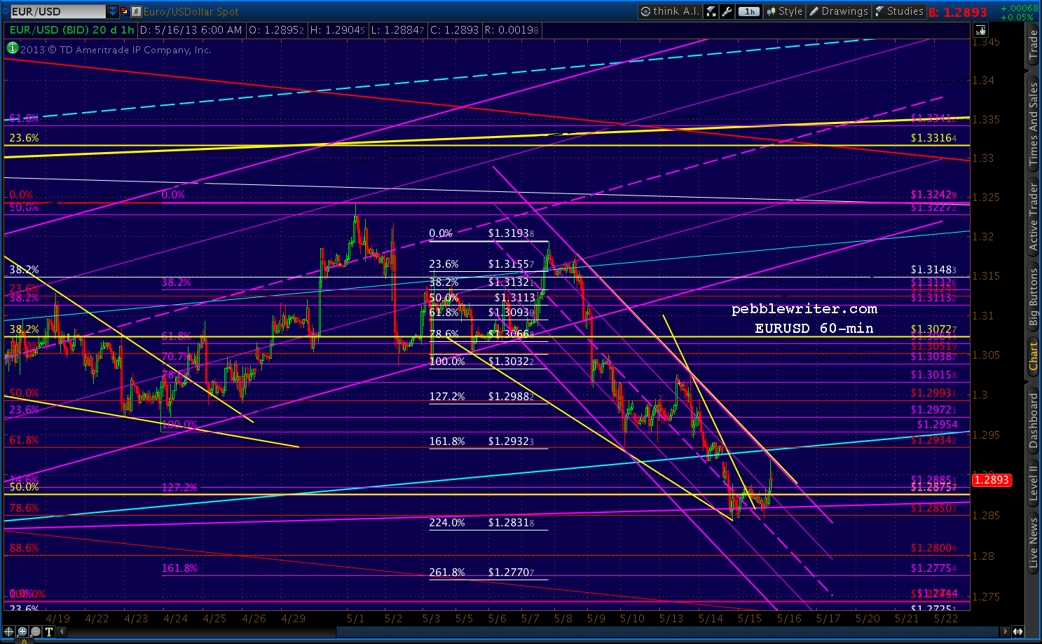 The EURUSD rallied overnight, breaking out of the falling wedge but quite possibly morphing into a channel (purple.) The immediate downside still looks to me like the red .886 at 1.28 (though the smaller patterns suggest 1.2770-1.2775.)