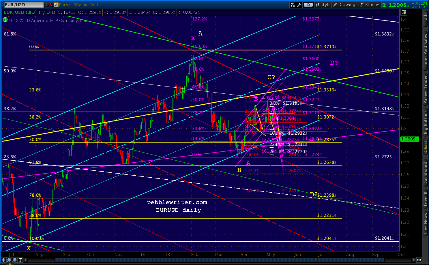 The red .886 could produce a back-test of some sort, but a drop below 1.2744 (the purple A) would officially kill off the purple harmonic pattern potential (Point C must be higher than A.)