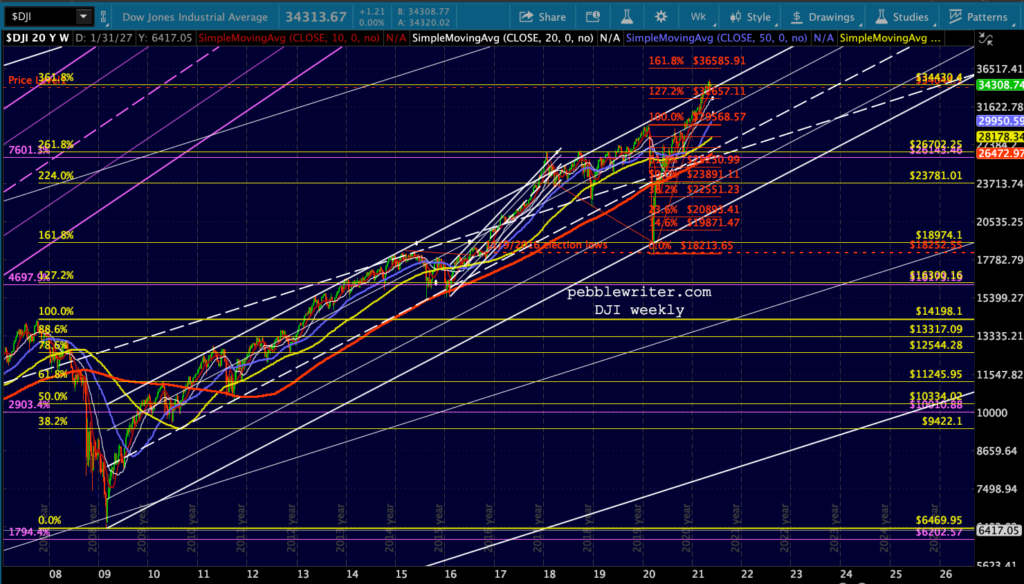 The Dow, the most easily and commonly manipulated index, has gone nowhere since failing to hold its 3.618 Fib extension at 34,430. It begs the question: what’s the holdup?