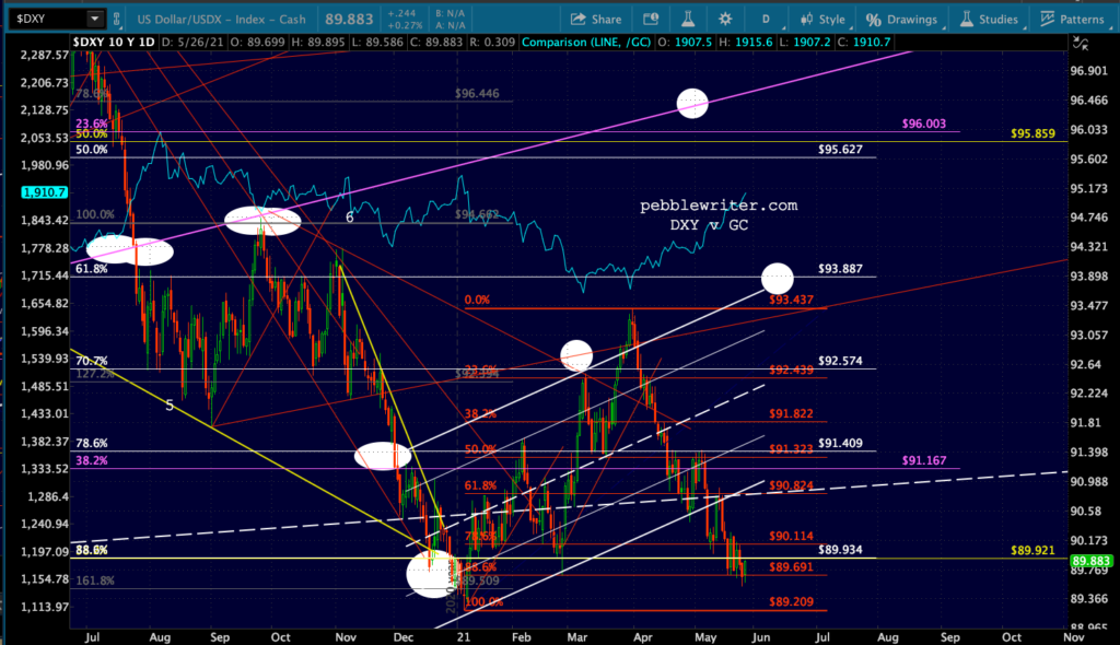 If the SMA200s don’t hold, the next real support is the Feb 2020 highs: a 19.9% drop for SPX and ES and a 15.7% decline for DJIA (if DJI can outperform, otherwise it’s -23% to the 2.618.) If DJI plunges all the way to its 2.618, it could easily drag ES/SPX down to theirs. This would be comparable to the Oct-Dec 2018 decline (SPX -20.2%, ES -21.4%, DJI -19.4%.) Timing? End of July (FOMC meeting July 27-28?) early August, to backtest the rising yellow channel midlines for ES/SPX and all three’s 200-week MA (just like SPX and ES did in Dec 2018.) This timing would also be comparable to the Sep-Dec 2018 correction.