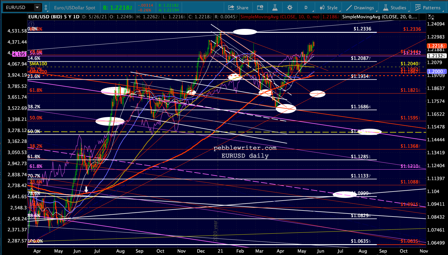It tested the 2.618 again on 4/23/19, falling 7.5% over six weeks, and spent about 4 months between June and October crisscrossing the 2.618 while bouncing off the SMA200 multiple times. By December, the SMA200 finally rose above the 2.618 and DJI was presumably in the clear.