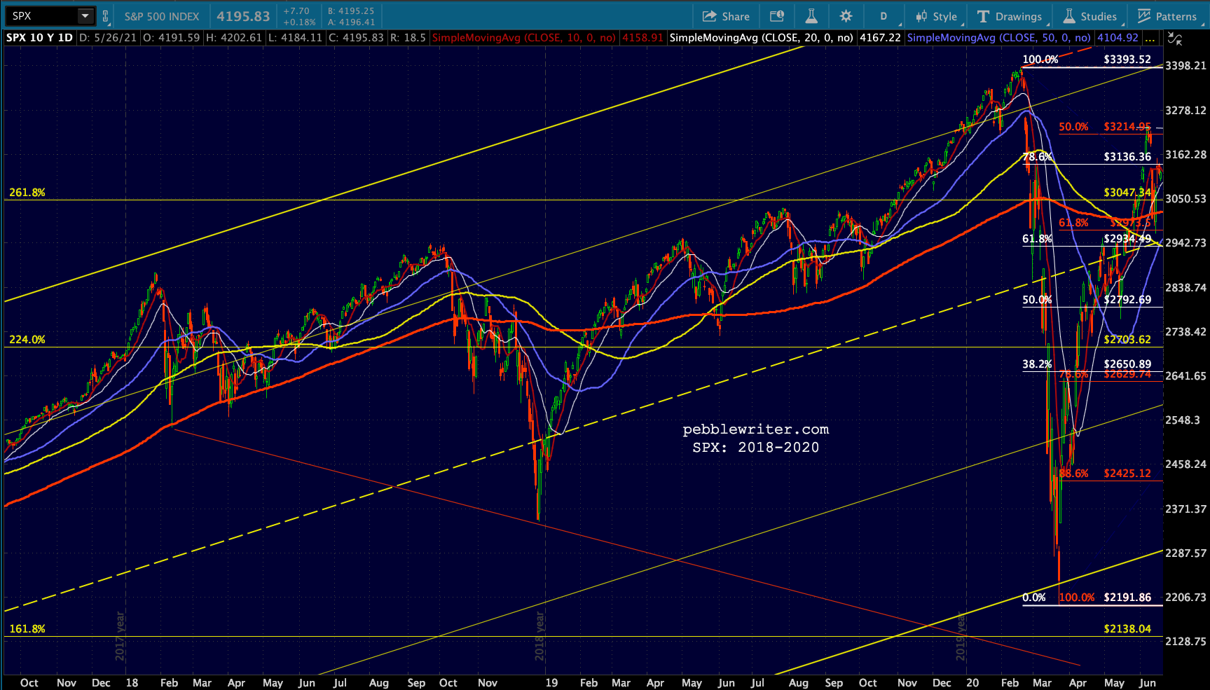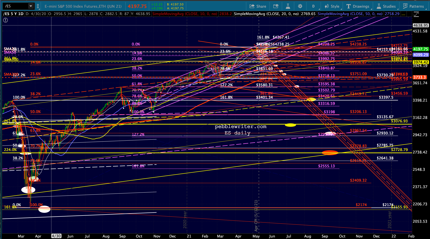 The 2/19/20 high of 3394 (10.2% above the 2.618, 10.4% for ES) was followed by a 35.4% (ES: 36%) plunge to 2192 by 3/23/20. No coincidence that the SMA200 had reached the 2.618 at 3047 on the very day SPX plunged to reach them both. Needless to say, TPTB would have loved to arrest the decline at that double support.