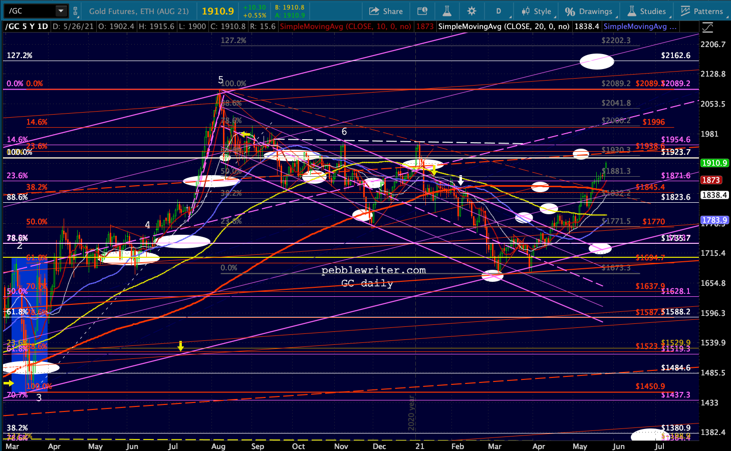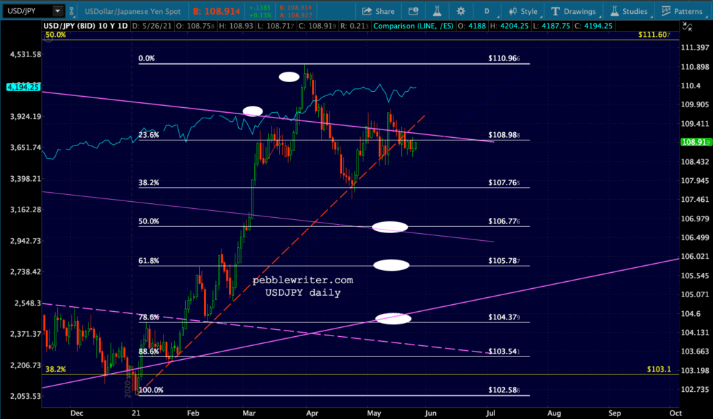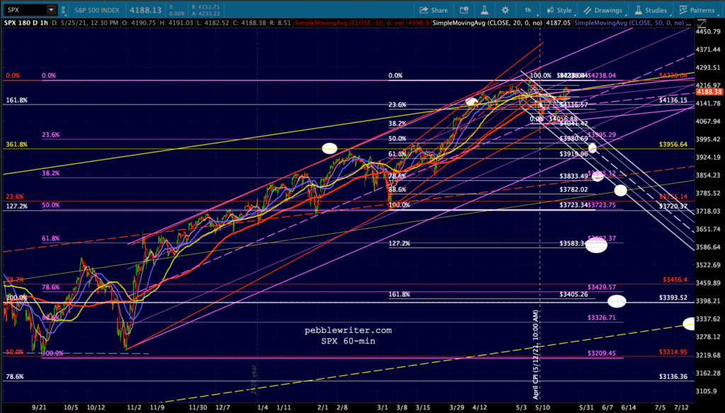 Let’s do the same exercise for ES. It rose above its 3.618 extension at 3998 by 6% before topping out at 4238.25 on 5/9. Major pullback targets would be:
