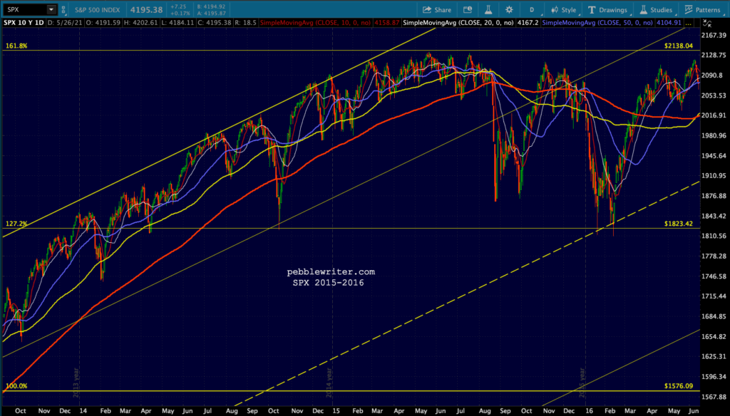 Usually, when a closely followed index goes sideways for a while, it’s because an important moving average is moving into position for a backtest. But, is that the case here?