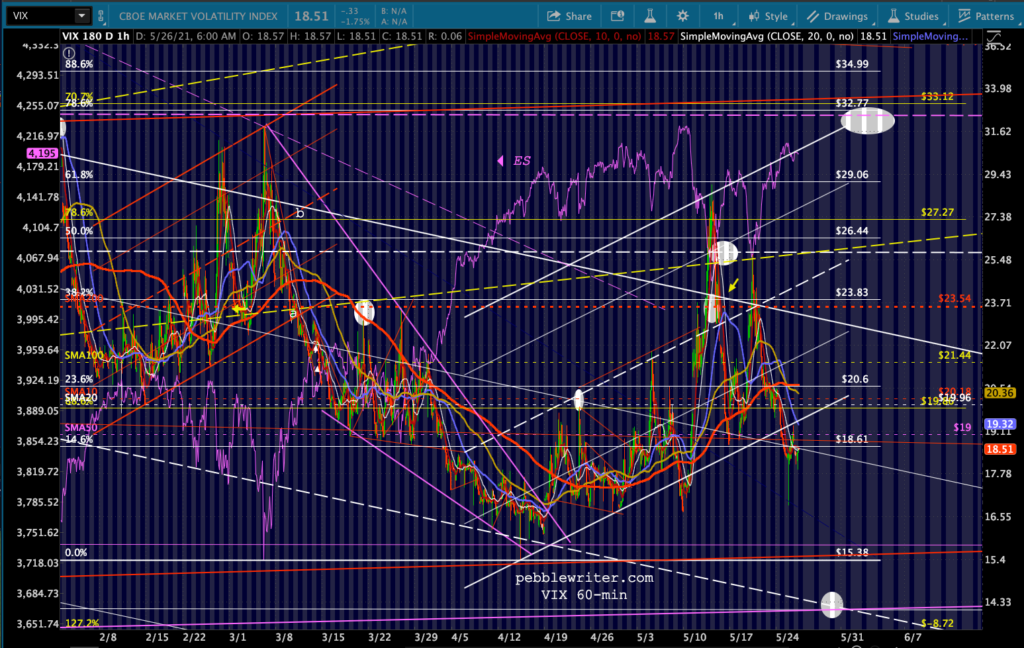 The first real support for the major indices would be SPX’s 6.6% (from its highs) decline to its 3.618 at 3956.64, which aligns with declines of 5.7% for ES and 6.9% for DJI. All 3 will have also backtested their SMA100s. This could be comparable to the 1/26/18 setup where ES and SPX started 5.4% and 6.2% above their 2.24 Fibs and DJI which started right at its 2.618 Fib (versus its 3.618 now.) If it happens in the next day or two, both ES and DJI would also tag their purple channel bottoms.