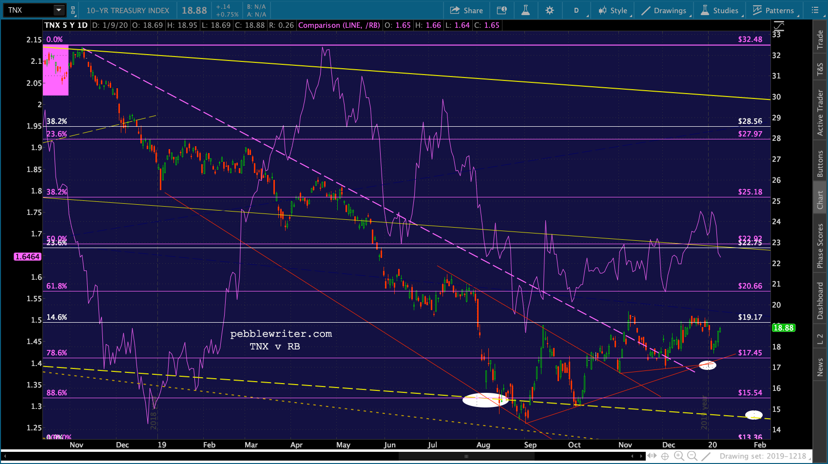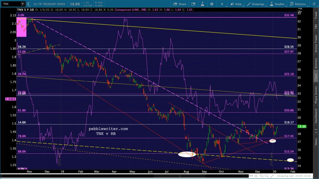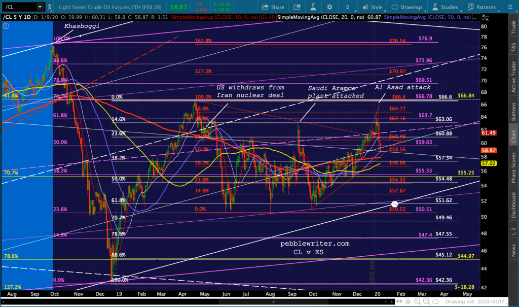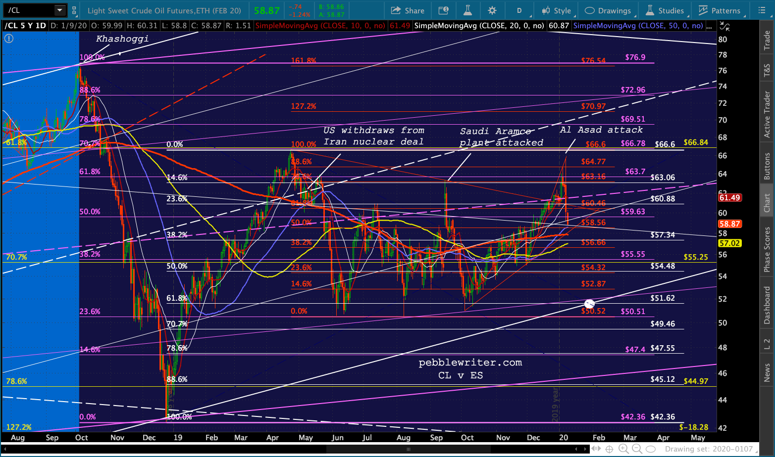…and if/when CL’s red TL breaks down. Its SMA200 is currently right on top of it at 57.03. I’m looking for a drop to the white .618 and white channel bottom at 51.62.