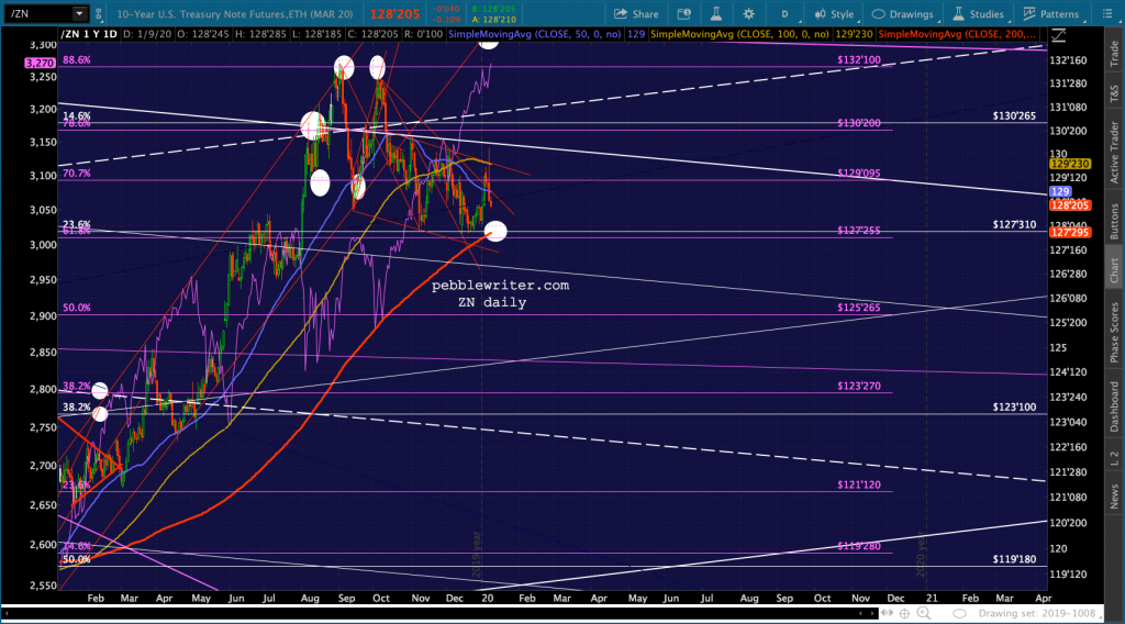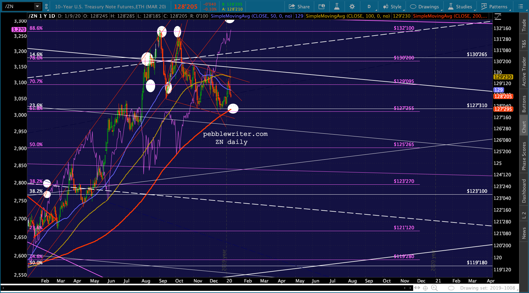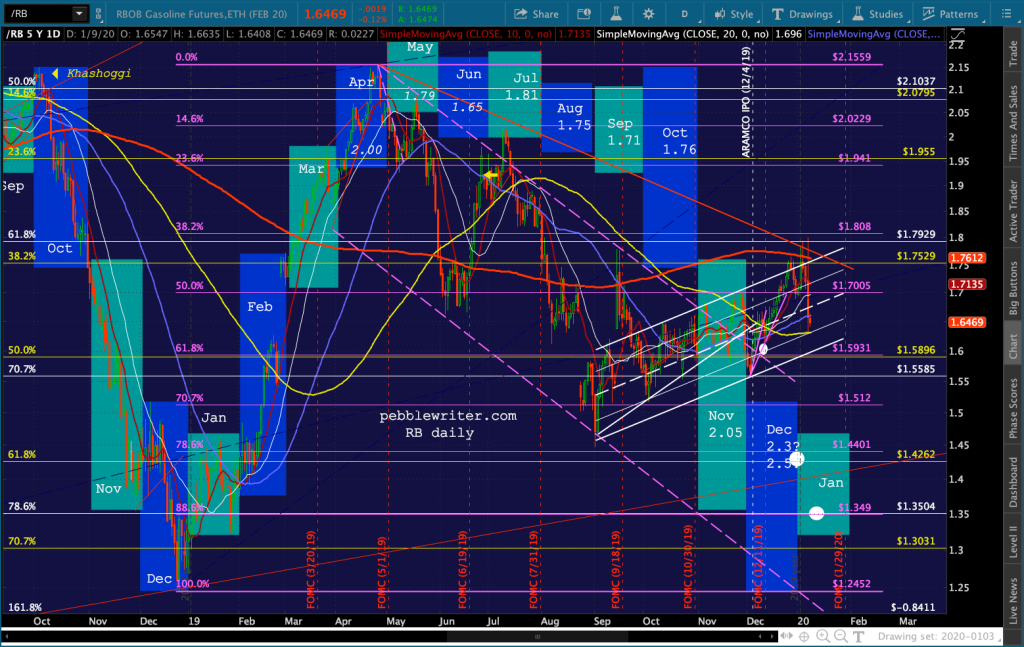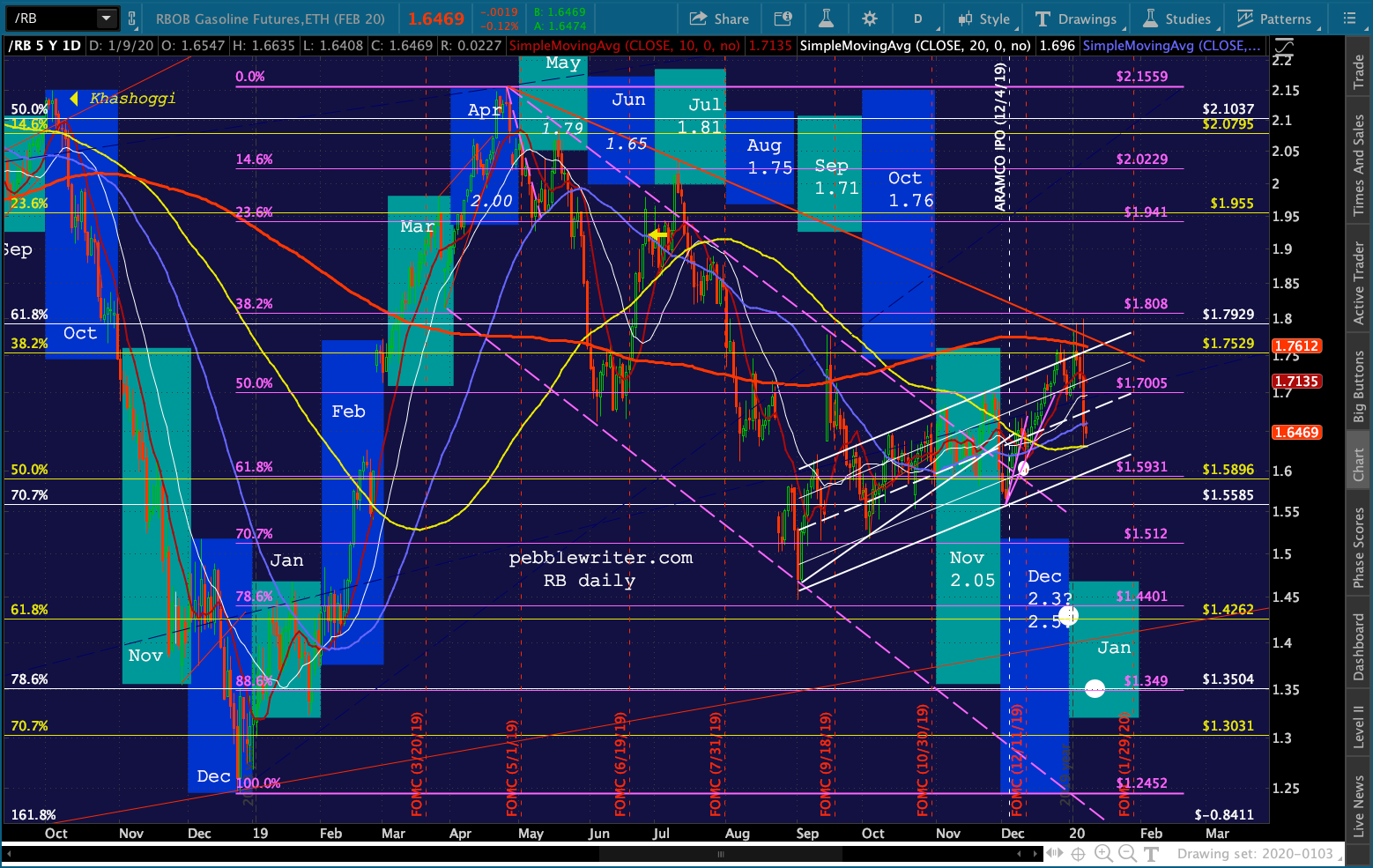 …and if/when CL’s red TL breaks down. Its SMA200 is currently right on top of it at 57.03. I’m looking for a drop to the white .618 and white channel bottom at 51.62.