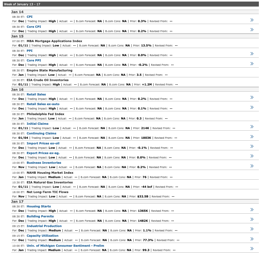 This week is almost over, with only tomorrow’s employment data left to digest. But, next week is chock full of potentially unsettling data: CPI, PPI, retail sales, Philly Fed, housing starts, building permits, industrial production and Michigan sentiment.