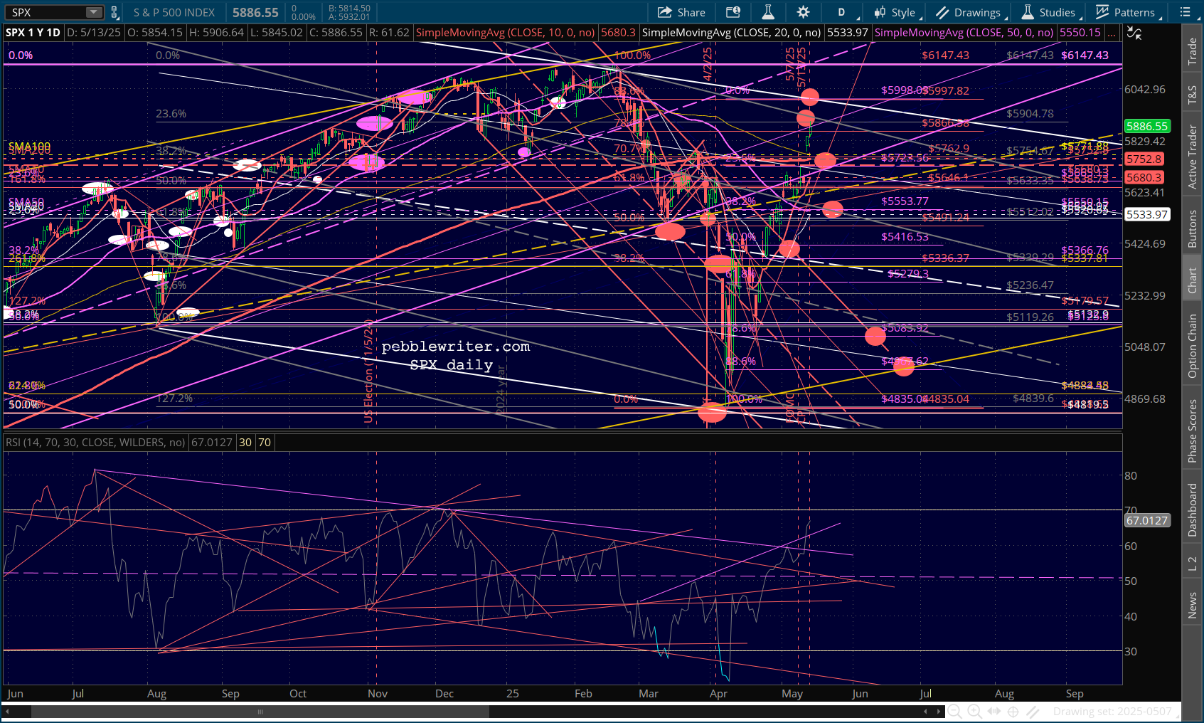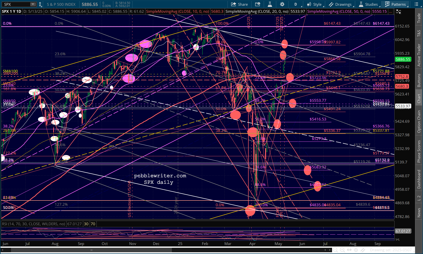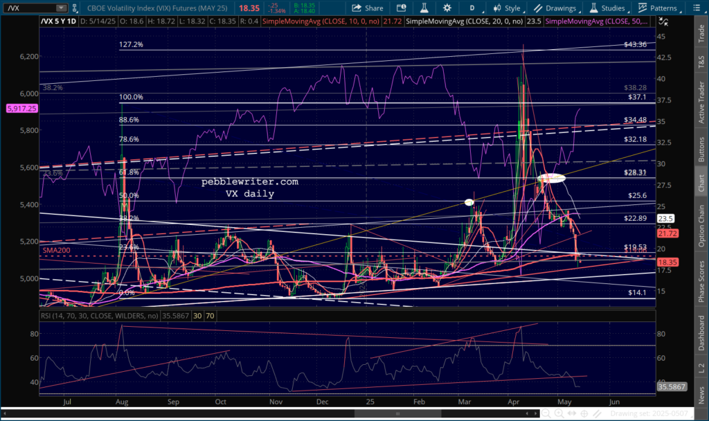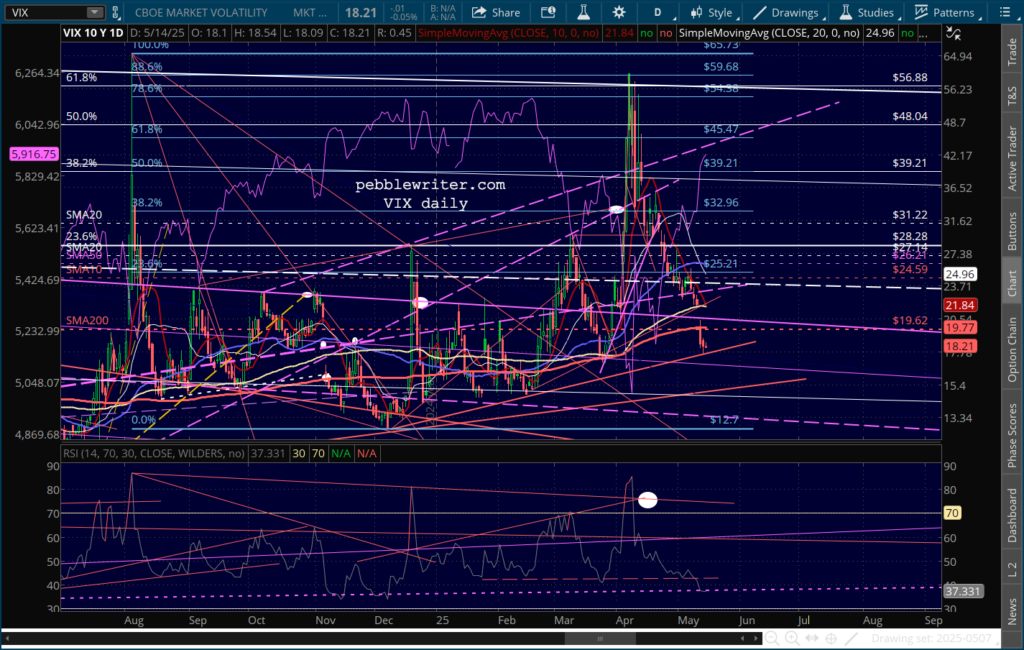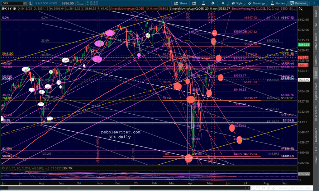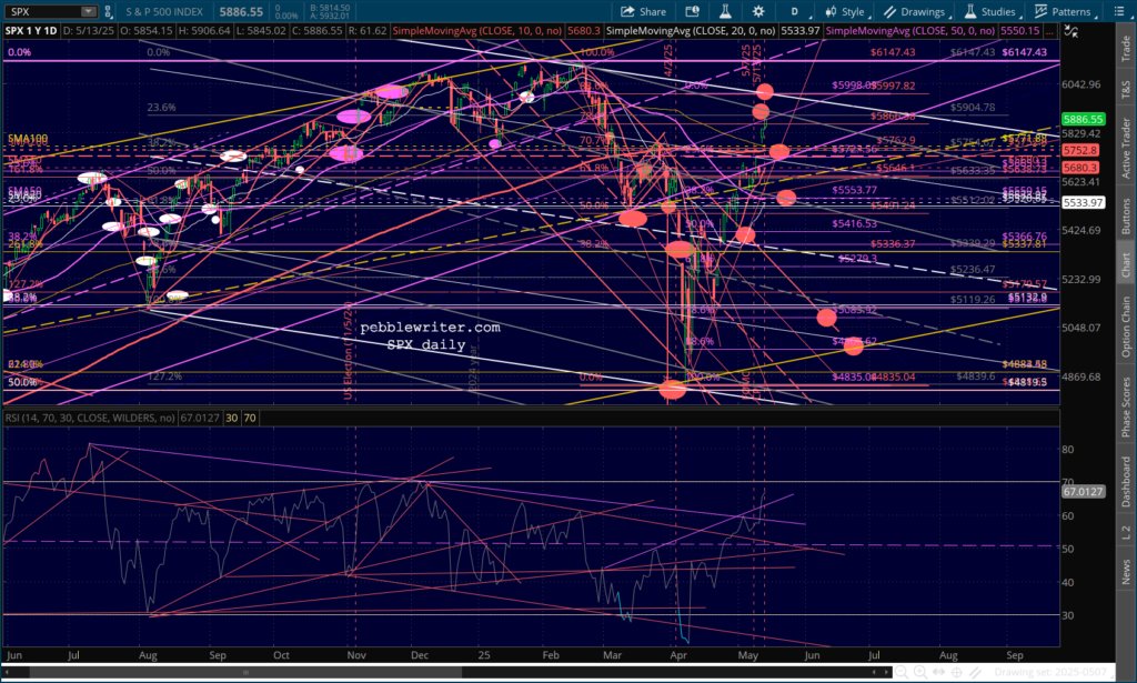 …SPX is lodged between its .786 and .886 Fib, with an RSI that broke out above resistance and isn’t at an obvious turning point.