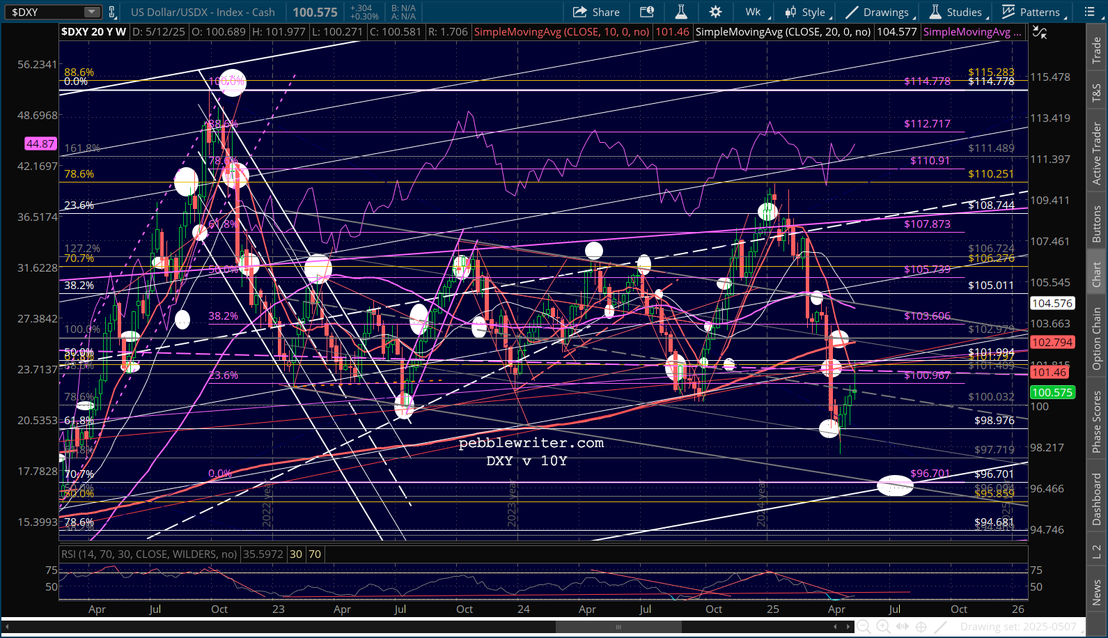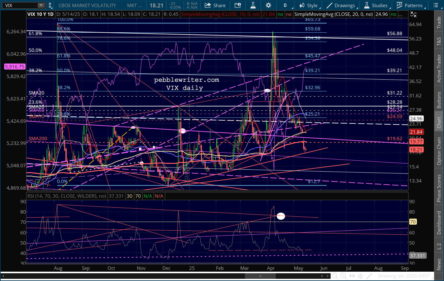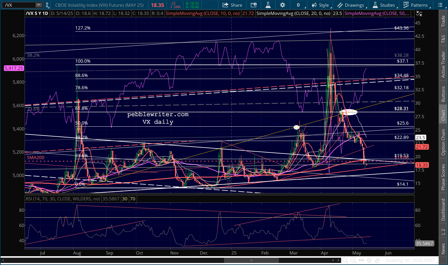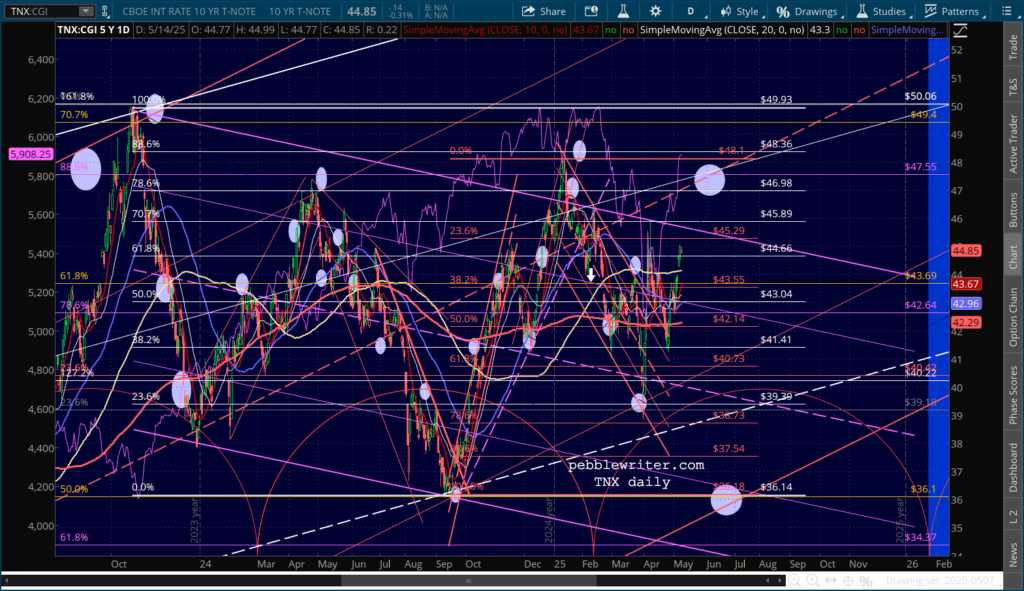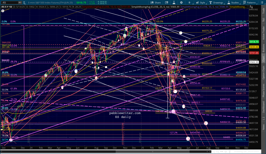 …SPX is lodged between its .786 and .886 Fib, with an RSI that broke out above resistance and isn’t at an obvious turning point.