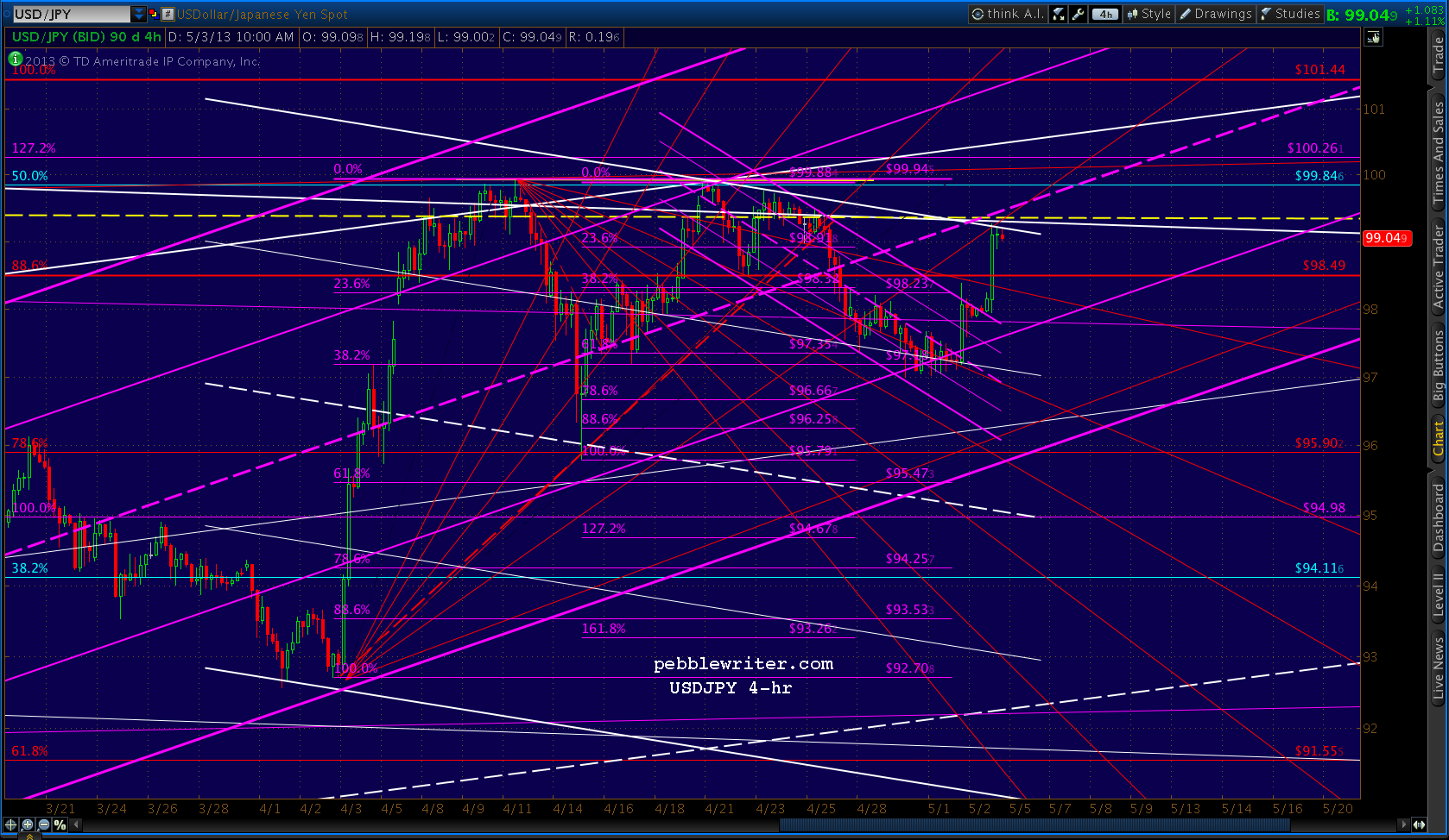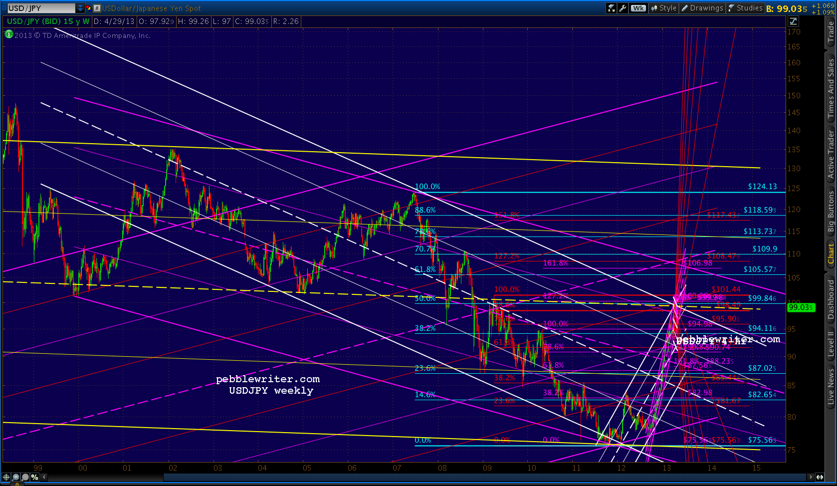 Regardless, the big purple channel will probably continue to provide the best clues for the upside. Note that the red circle sits at the intersection of the .75 line and the 1.618, while the white circle is at the more likely midline/1.618 intersection.