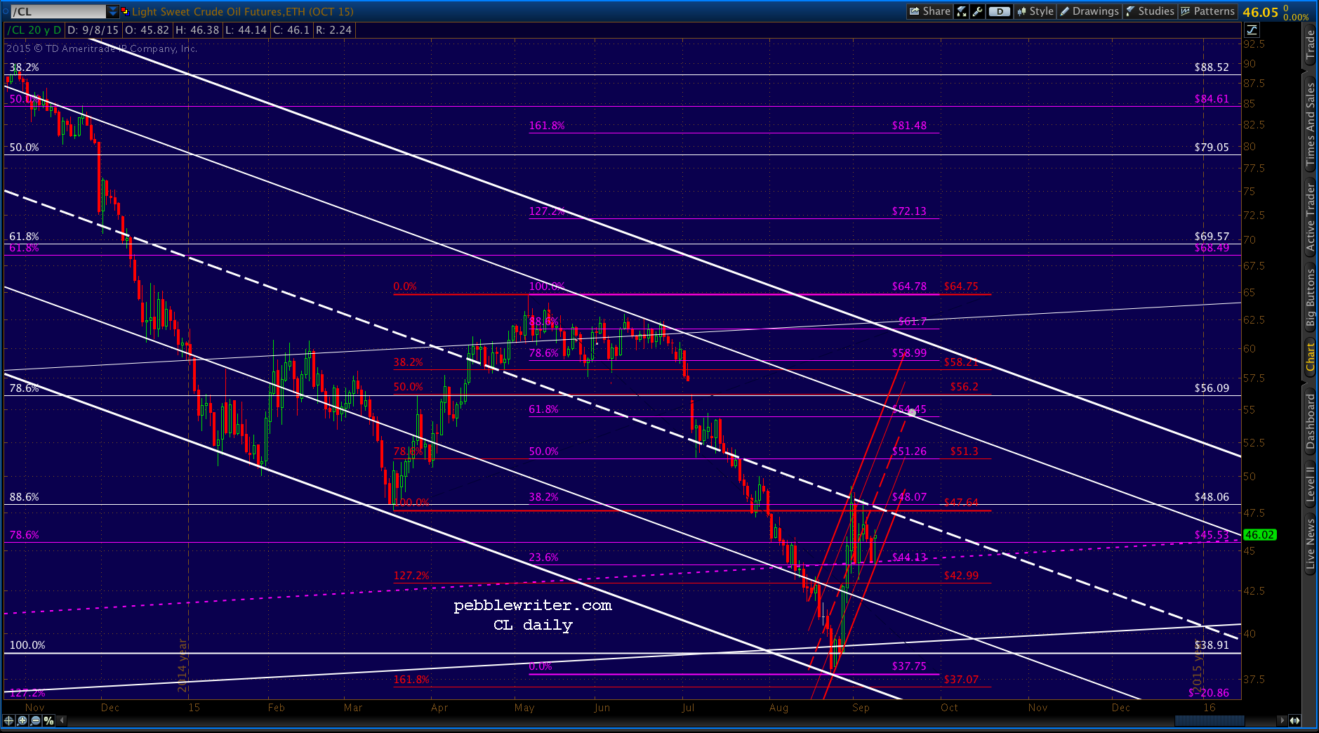 USDJPY’s move… There’s plenty more room in the falling purple channel for upside. So, keep a close eye on it. A push through the .786 line would be reason enough to dump the SPX short.
