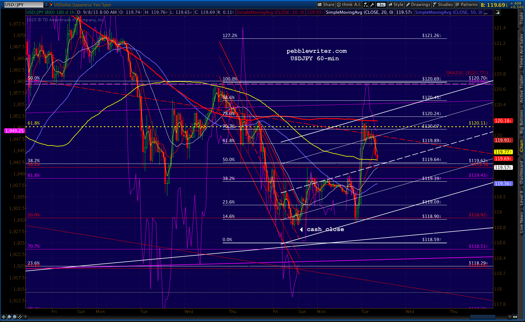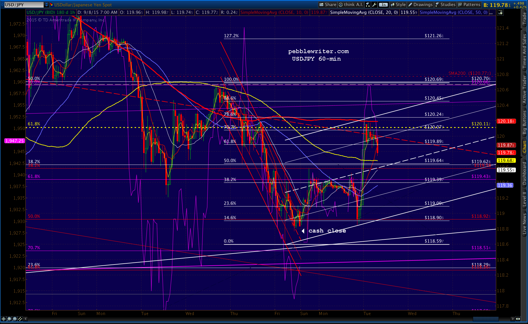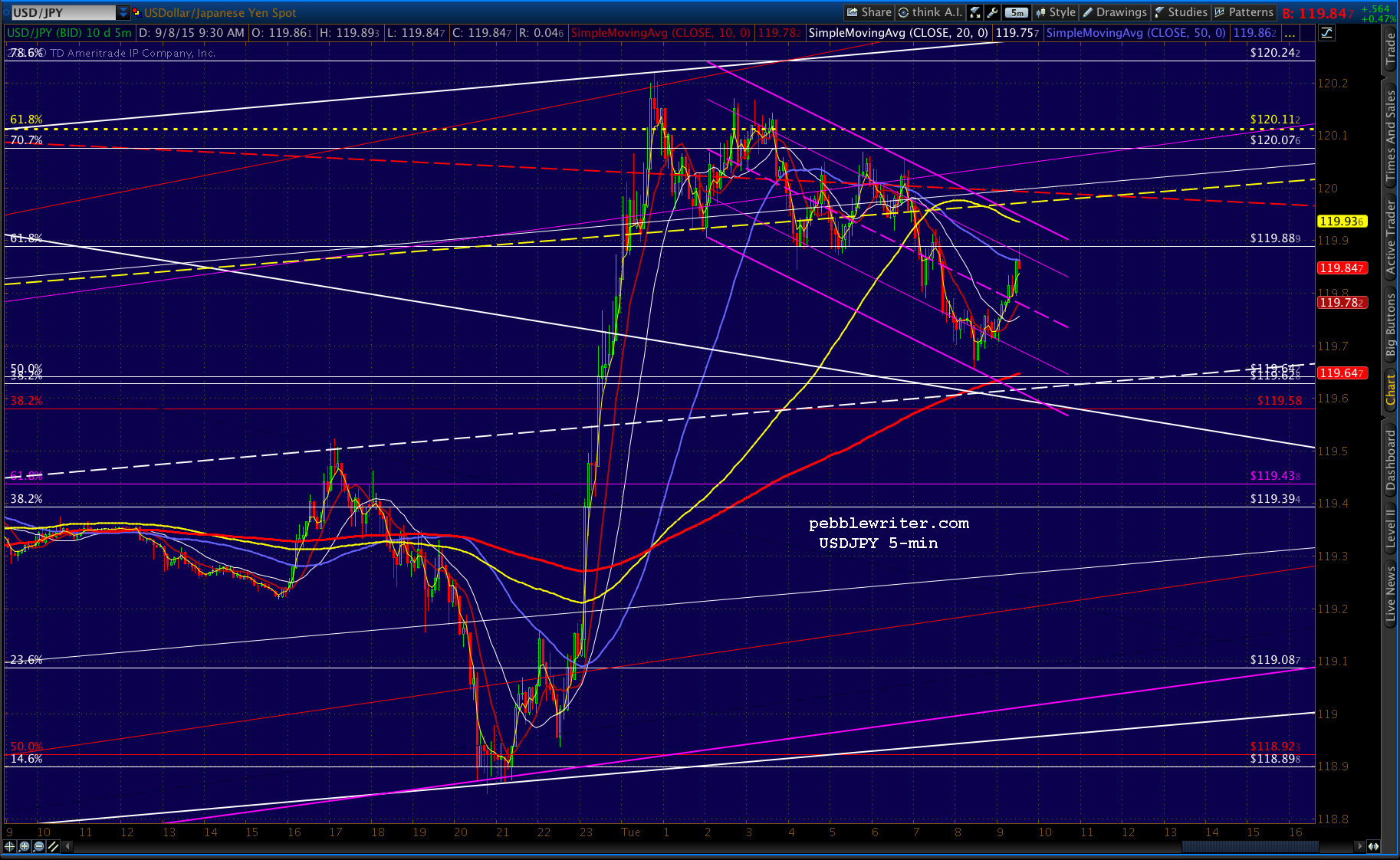 Keep an eye on USDJPY, which has also reached double channel midline resistance and is just shy of the .618 retrace from this morning’s highs (120.004.) A failure to pop through would be dangerous for the bulls.