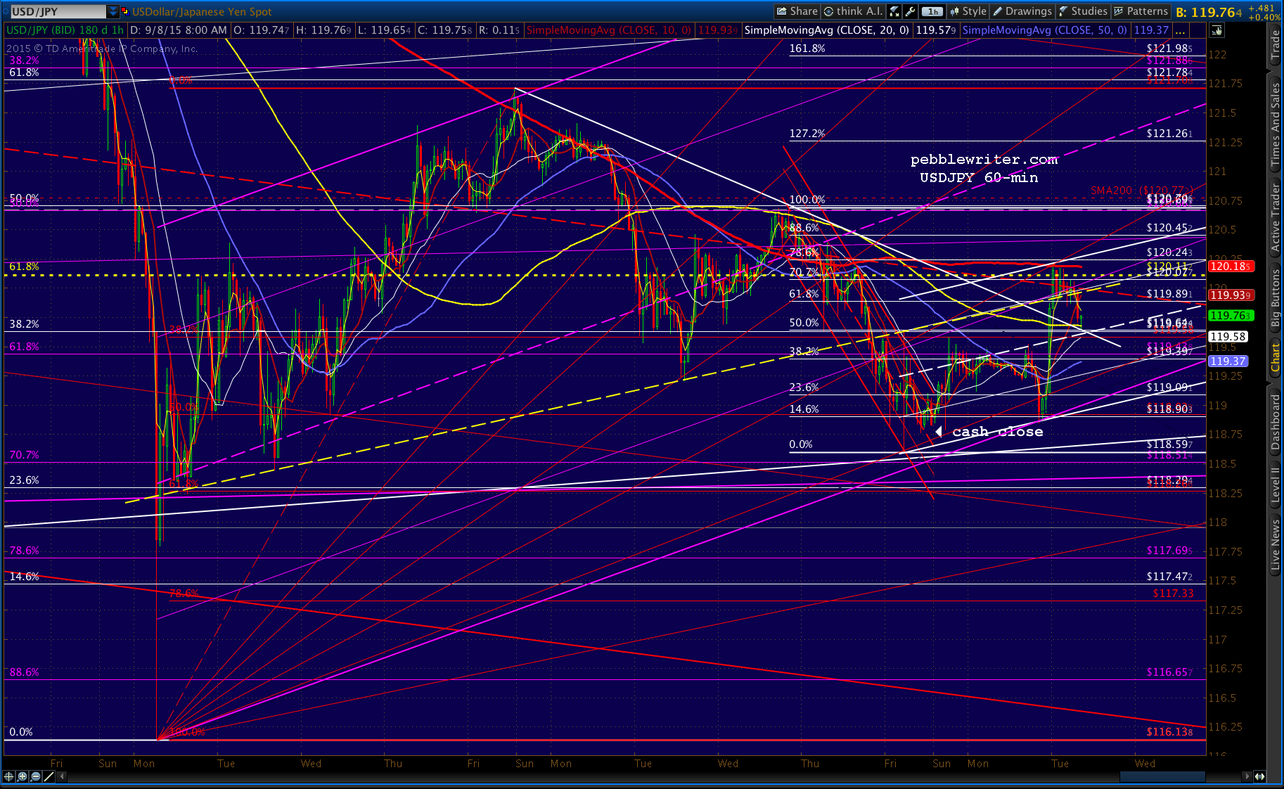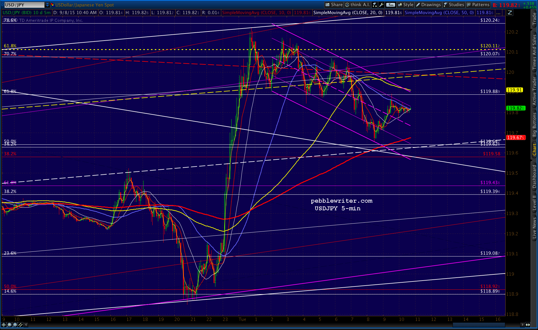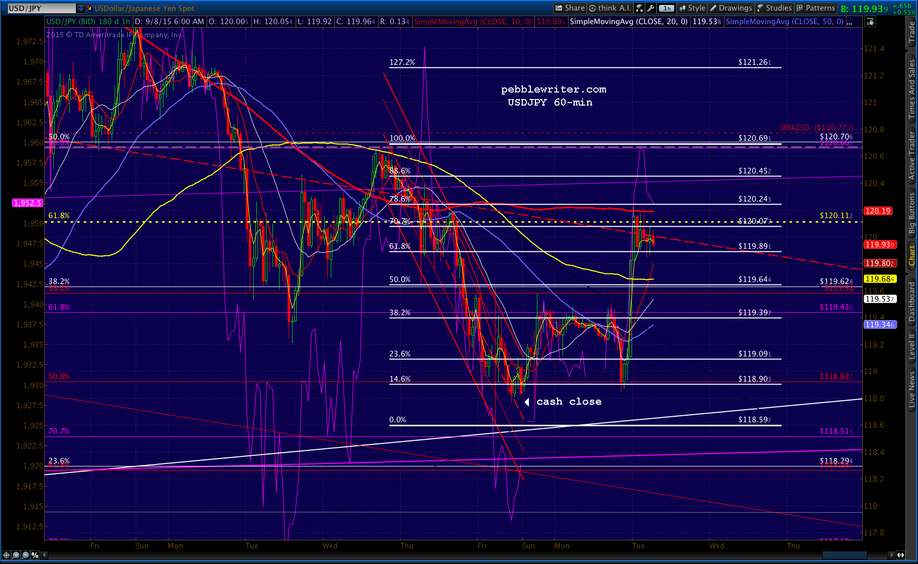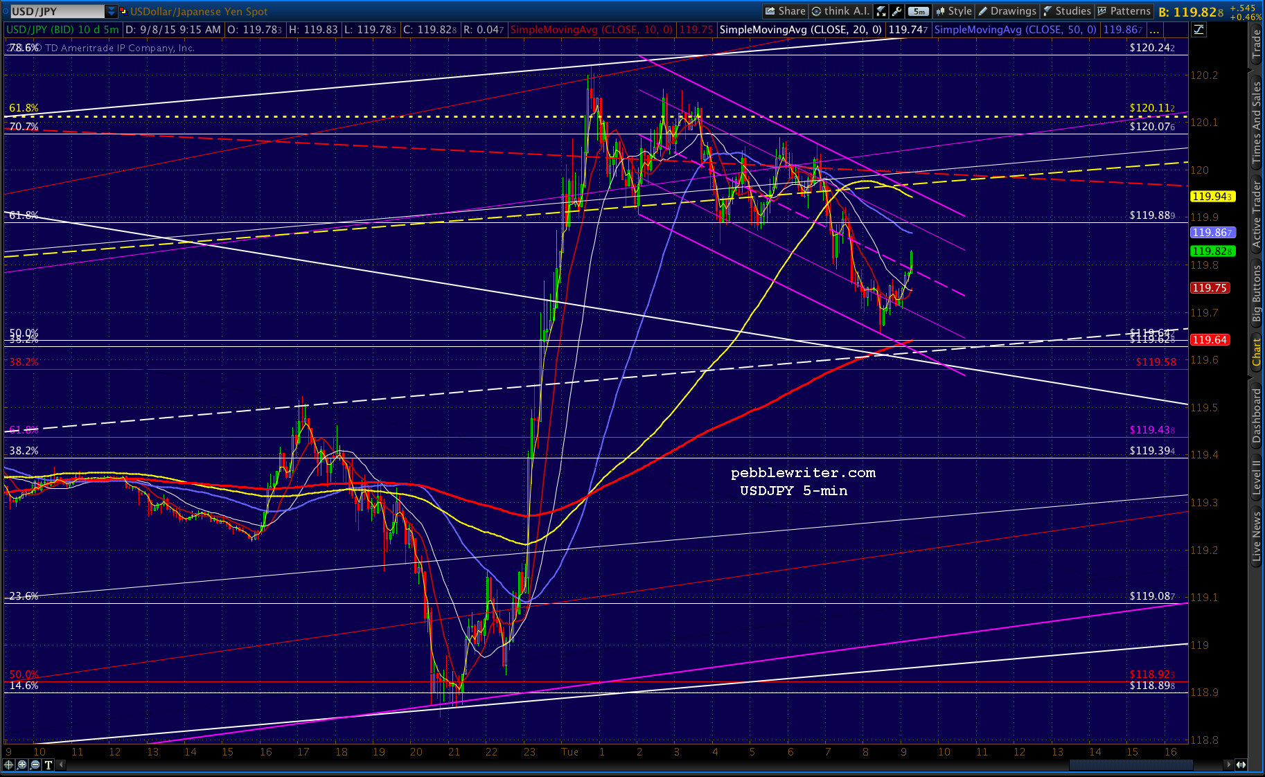 Keep an eye on USDJPY, which has also reached double channel midline resistance and is just shy of the .618 retrace from this morning’s highs (120.004.) A failure to pop through would be dangerous for the bulls.