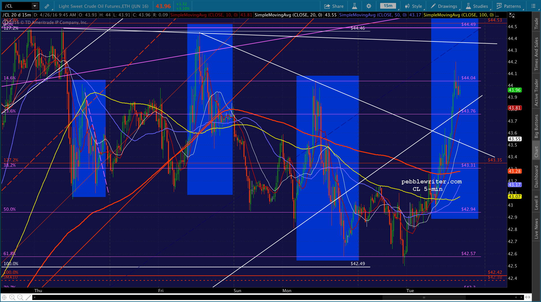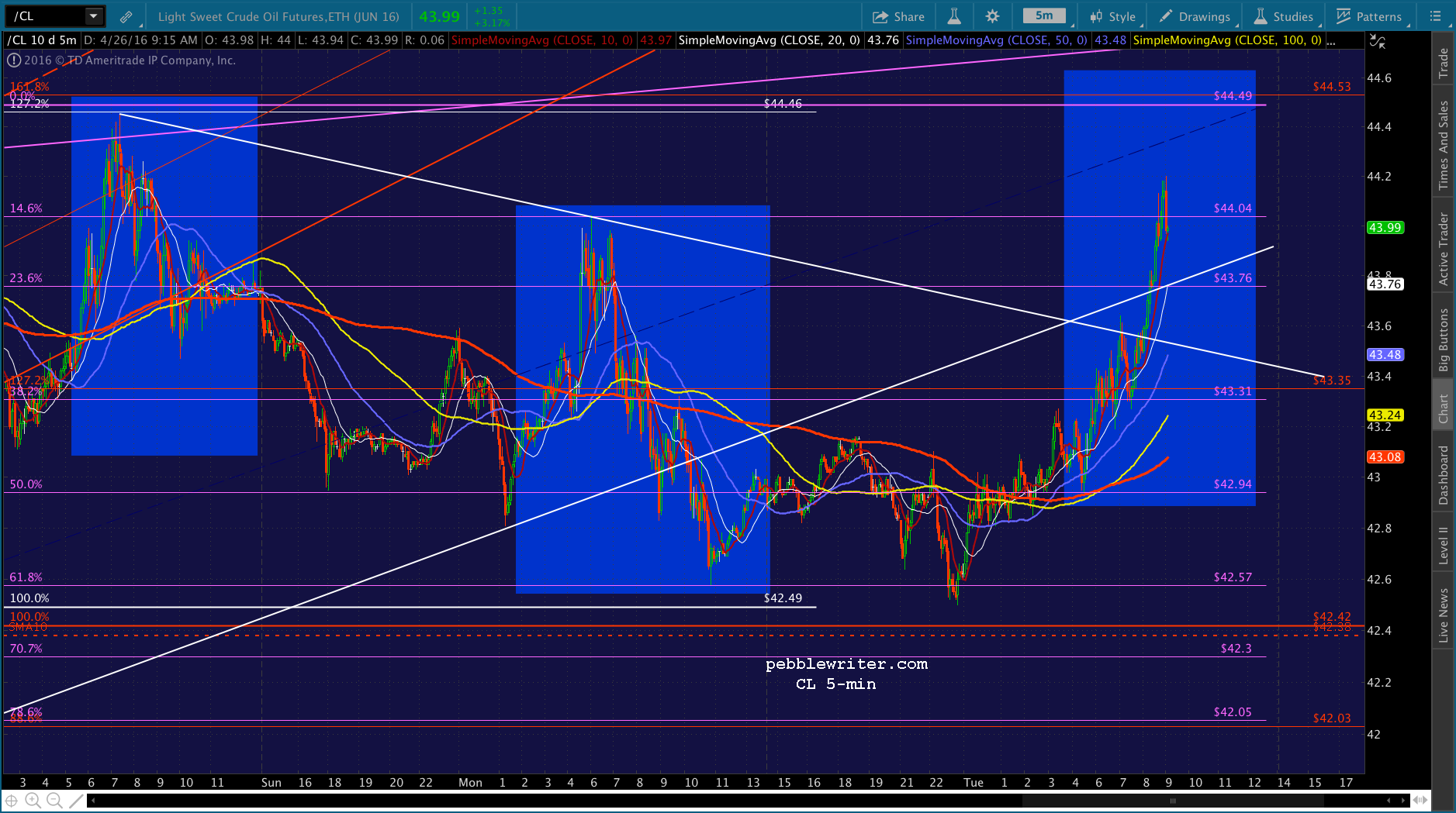 SPX just closed this morning’s gap and backtested the SMA10. It should get down to the SMA5 200 at 2086.45, but the SMA10 is arguably more important support. Given that CL has moved up to the white TL, threatening a breakout, I’d be inclined to take profits here and go to cash. If it drops below the white midline, (2085.33ish) we can always reopen a position for the next 13 points.