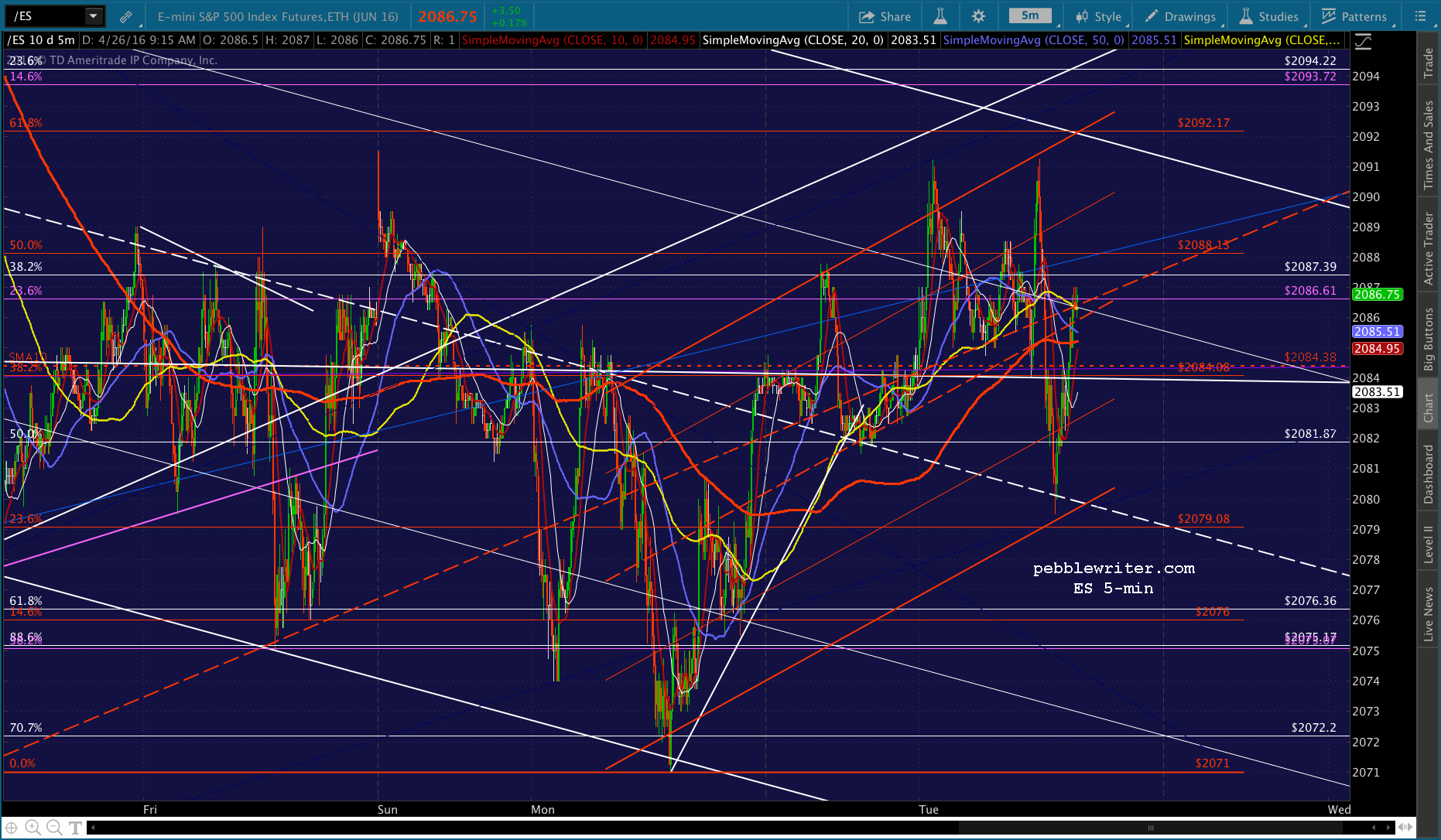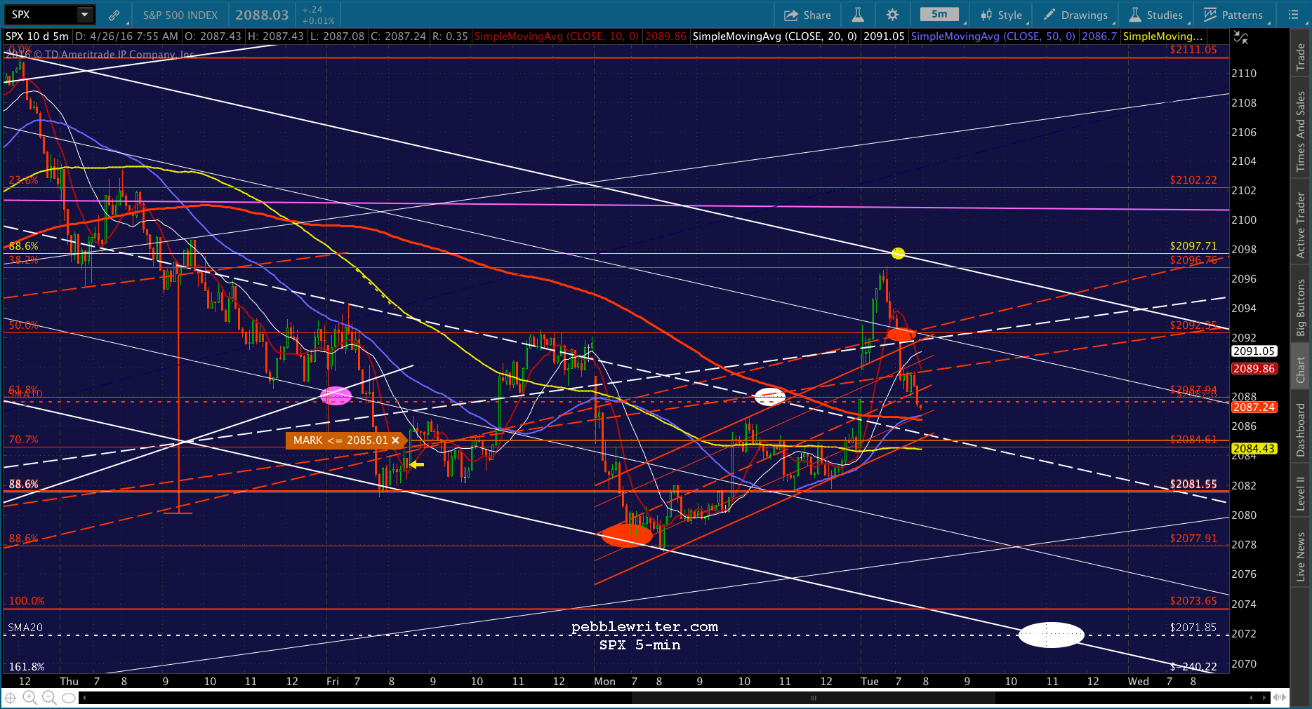 SPX tagged the .500 Fib at 2092.35 and seems to be backing off. But, CL appears to be breaking out and ES found support at its SMA5 200 and its now higher SMA10 at 2084.38. Consumer confidence is coming out at 10:00, which will probably determine whether or not SPX breaks past 2092.35. I’d short here, but with very tight stops. If it breaks out, the top of the falling white channel is around 2097.71.