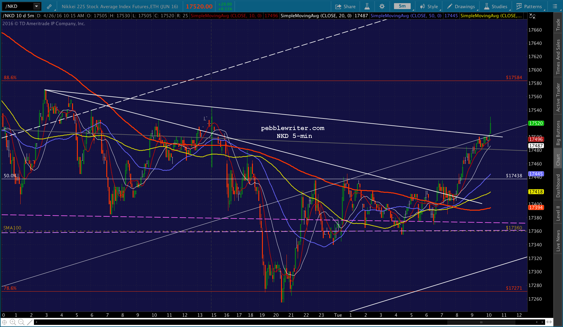 Not looking very good for the short position working out. Notice that NKD has worked its way up to the TL connecting previous highs as well as the white channel .236 line. If it pops out, SPX will head higher. CL and USDJPY are showing no signs of letting up, though USDJPY is showing signs of a rising wedge — which used to be a pretty good bearish sign back when every little dip wasn’t managed by TPTB. Watch your stops.