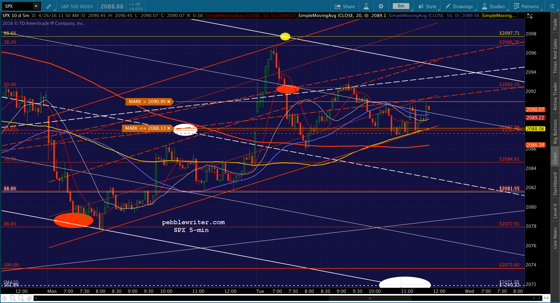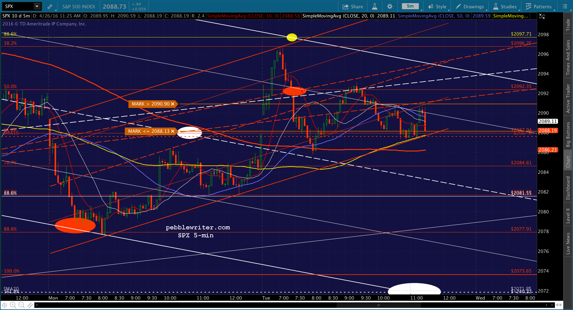 SPX is swinging around a lot now, even though the moves are relatively small. As mentioned earlier, I have to take off early. There’s obviously support at the red channel bottom, and below that at the SMA5 200 at 2086.40. Below that, we have the white channel midline at 2082.30-2082.50, depending on when, and finally the SMA20 at 2071.85.