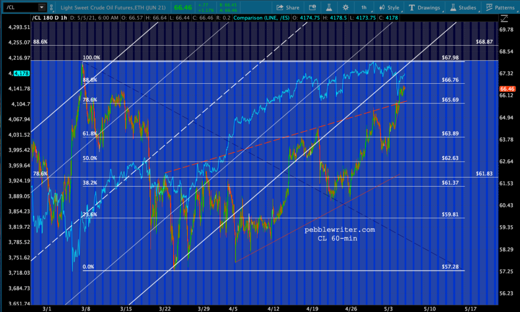 Speaking of rising oil and gas prices, CL sent a bullish signal by breaking above the red TL (though not quite reaching the .886 at 66.76)…