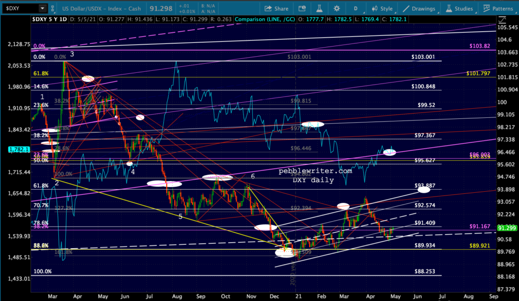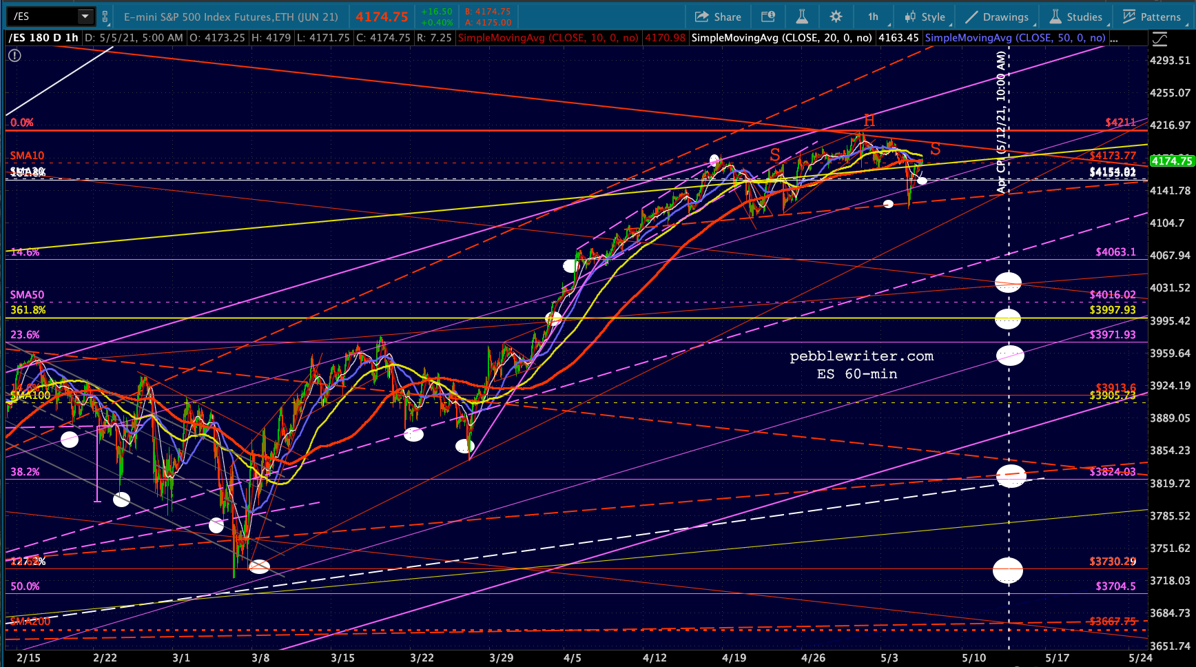 continued for members…Meanwhile, ES has reached a backtest of its SMA10 – the dividing line between a continuation of the uptrend and another leg down. We have a new H&S Pattern to watch, this one suggesting a 90-pt decline.