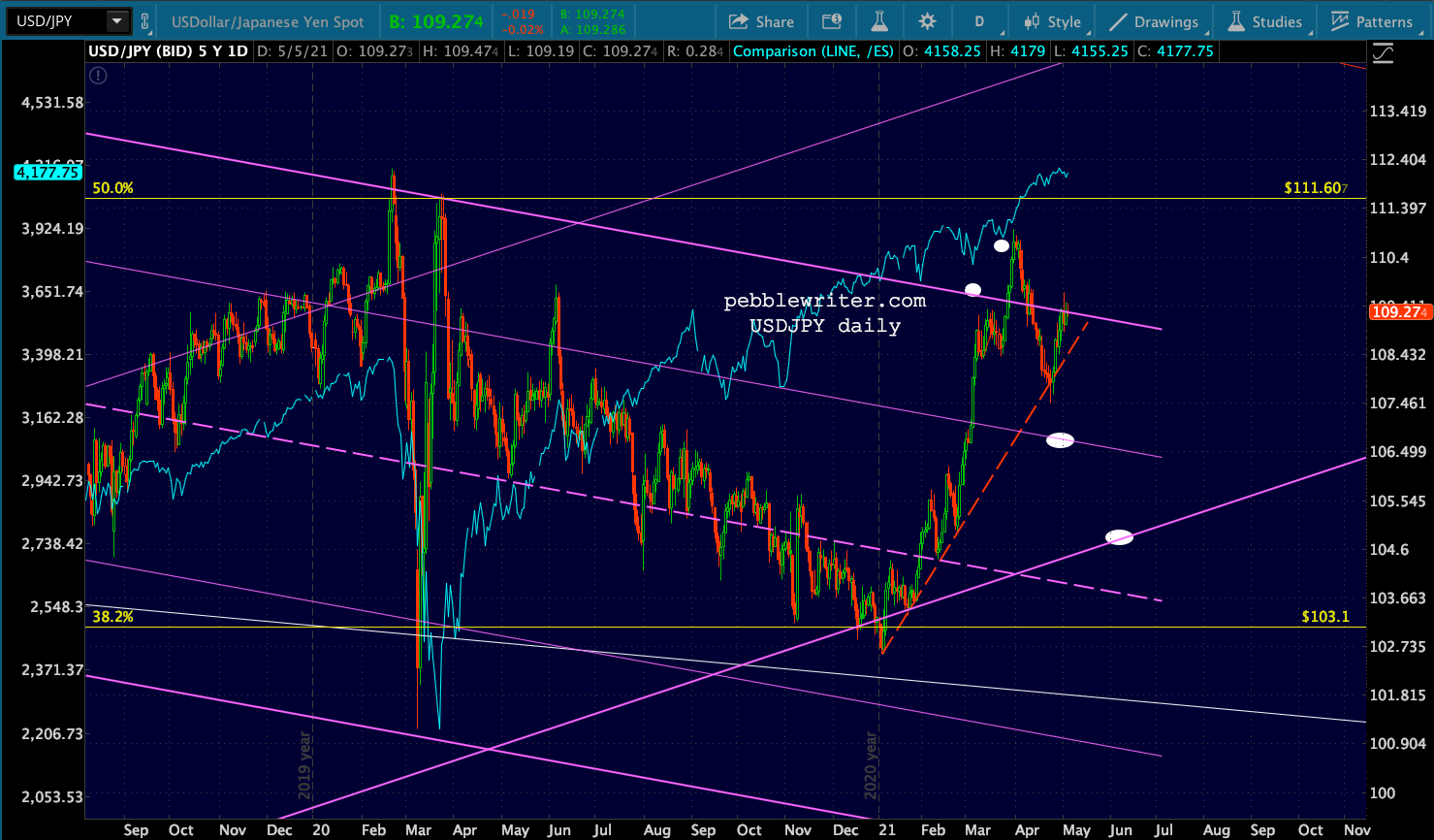 USDJPY is still on the bubble – threatening a breakout of the falling purple channel.