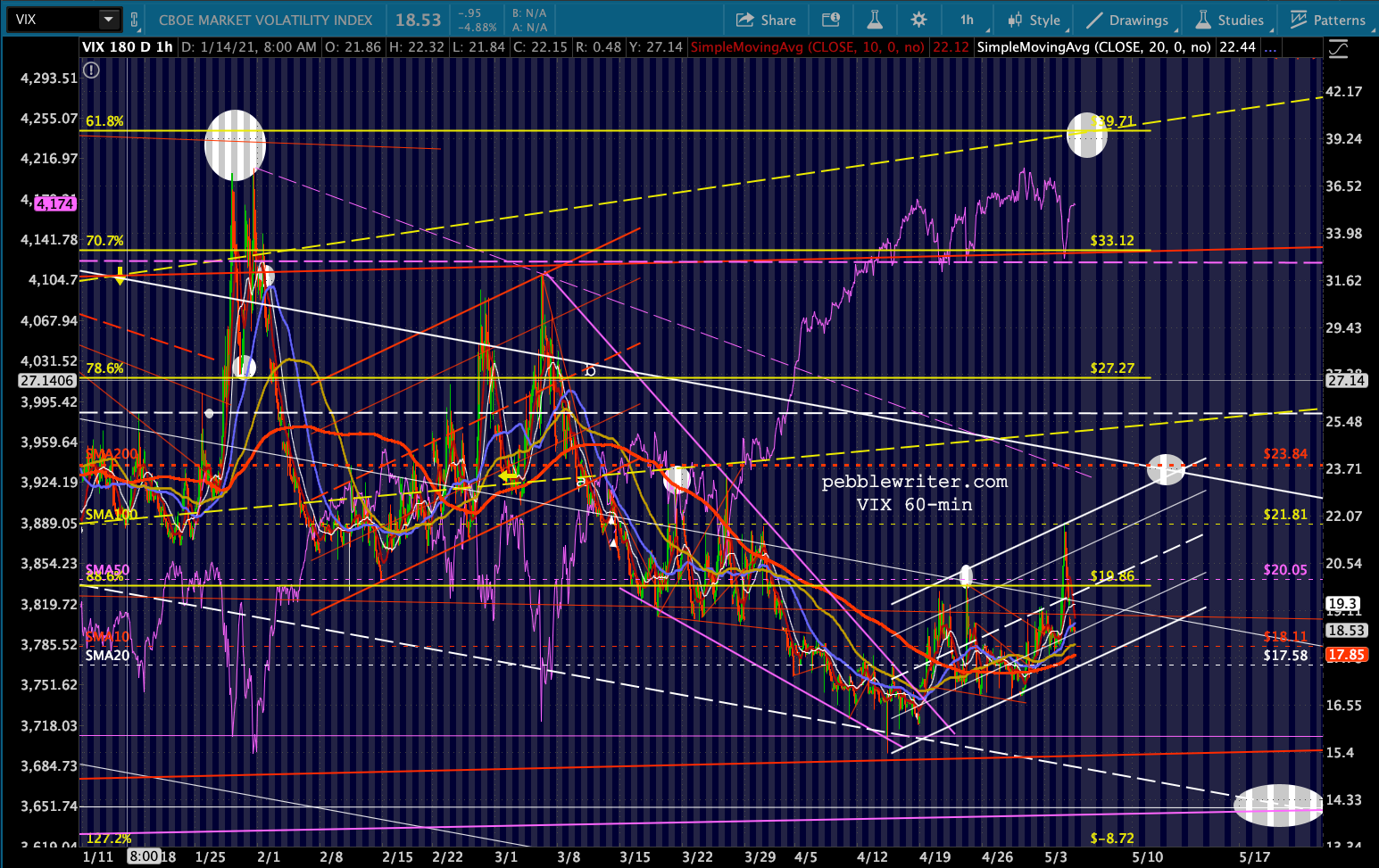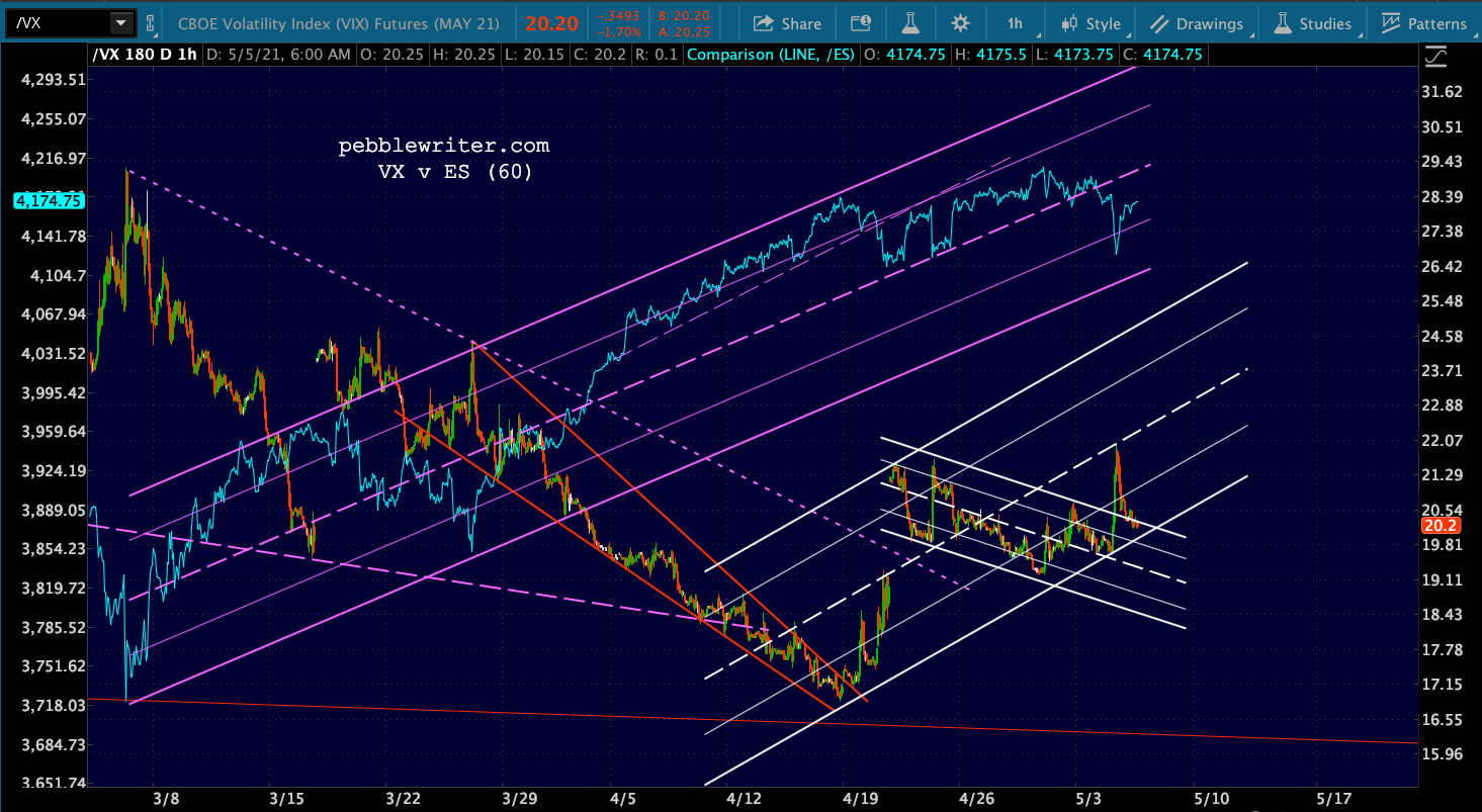VIX continues to have potential up to its SMA200 at 23.84, while the futures have completed, broken out of, and backtested a flag pattern targeting 24.